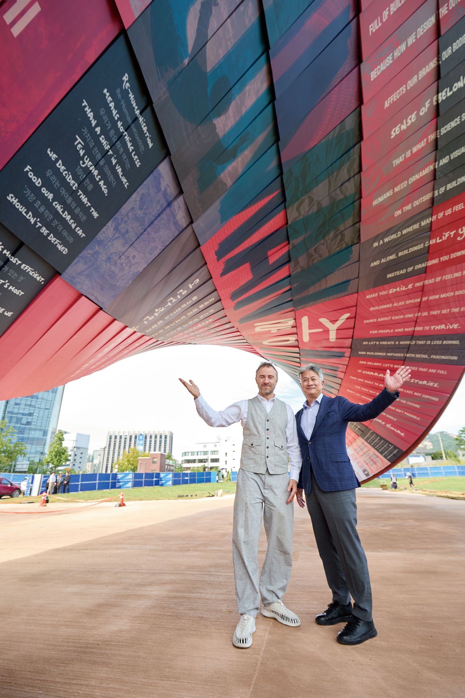 Thomas Heatherwick revealed that he was inspired by jogakbo, traditional Korean patchwork. To go beyond this point of inspiration, he originally imagined an outdoor structure made of fabrics, however during the design development, he struggled with unfavorable environmental conditions. Under such circumstances, Chang Saewook (vice chairman of Dongkuk steel group), showed an interest in this challenging project and kindly proposed a solution: to use an different product, Luxteel, a premium printed steel product by Dongkuk CM. While reviewing the alternative product, Luxteel, Heatherwick sensed the multiple advantages of using Luxteel and he gladly accepted the proposal. Its primary benefits can be summarised into two ways – durability and a resistance to discolouration and corrosion over 30 years – and its environmental benefits are also persuasive, as an alternative to stone or wood, as well as offering unlimited expression in terms of colour and texture. This project went beyond simple sponsorship; it was a genuine collaboration between Dongkuk CM and Heatherwick Studio. When the installation work was completed, Heatherwick was impressed by the high quality of the final outcome and credited this achievement to the passion and artisanal commitment of the Luxteel team. He described Humanise Wall as a co-created work, a product of partnership. This collaboration extends far beyond material supply, it is an artwork aligning architectural vision with corporate technology.