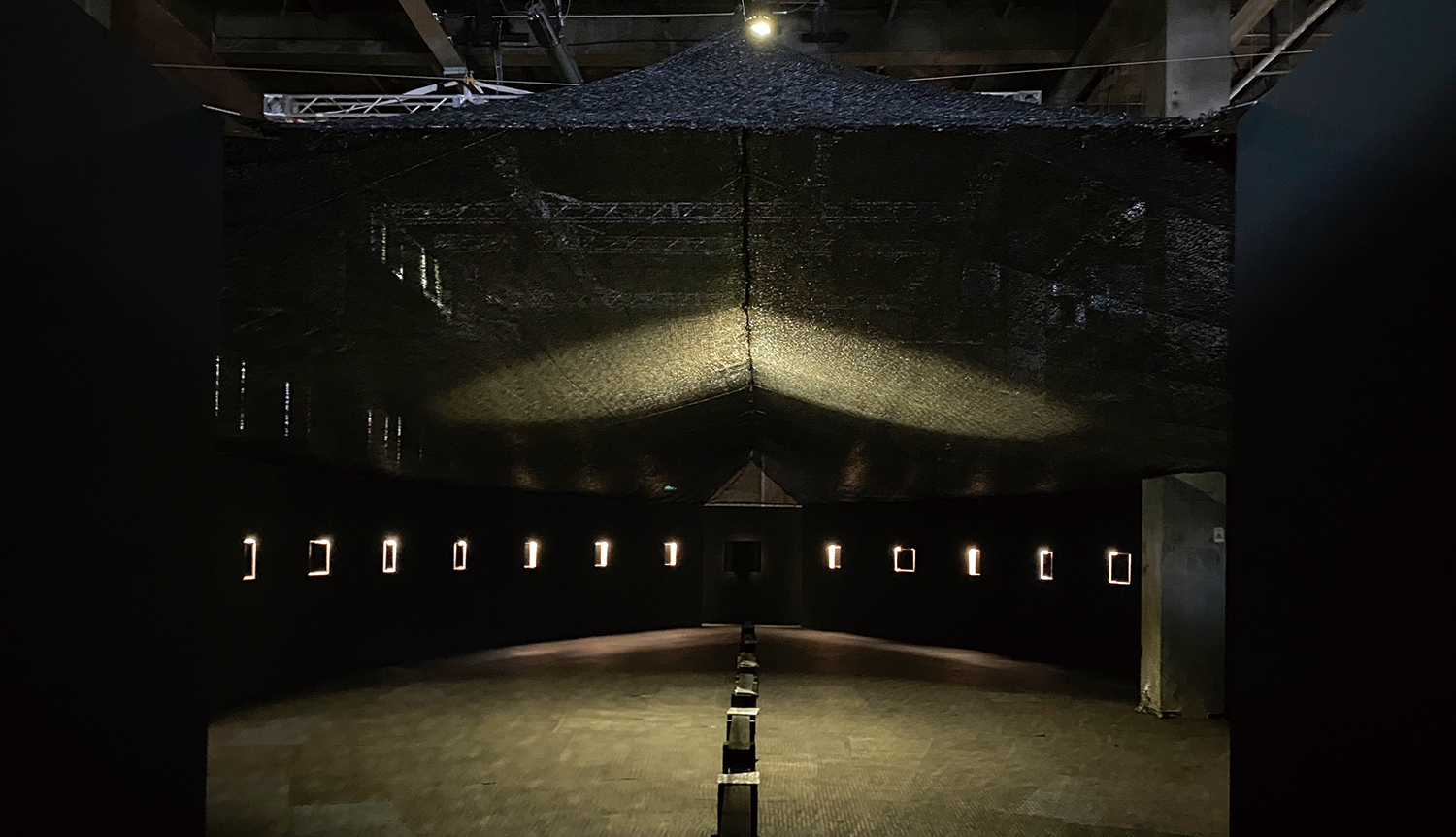 At the end of the curved pathway lies a darkened space shaped like a circus tent, realised through black HDPE Raschel Shade Net connected to the walls. Developed through continuous collaboration with Kuroda, this space draws inspiration from the idea of the circus tent as a realm of dreams and imagination, gradually immersing visitors within an imaginative world as they read the comics. Comic books are displayed here for reading, and the shadows cast onto the books recall comic¡¯s screentone printing technique, turning the visitors¡¯ space and shadows into a part of the comic¡¯s background.
