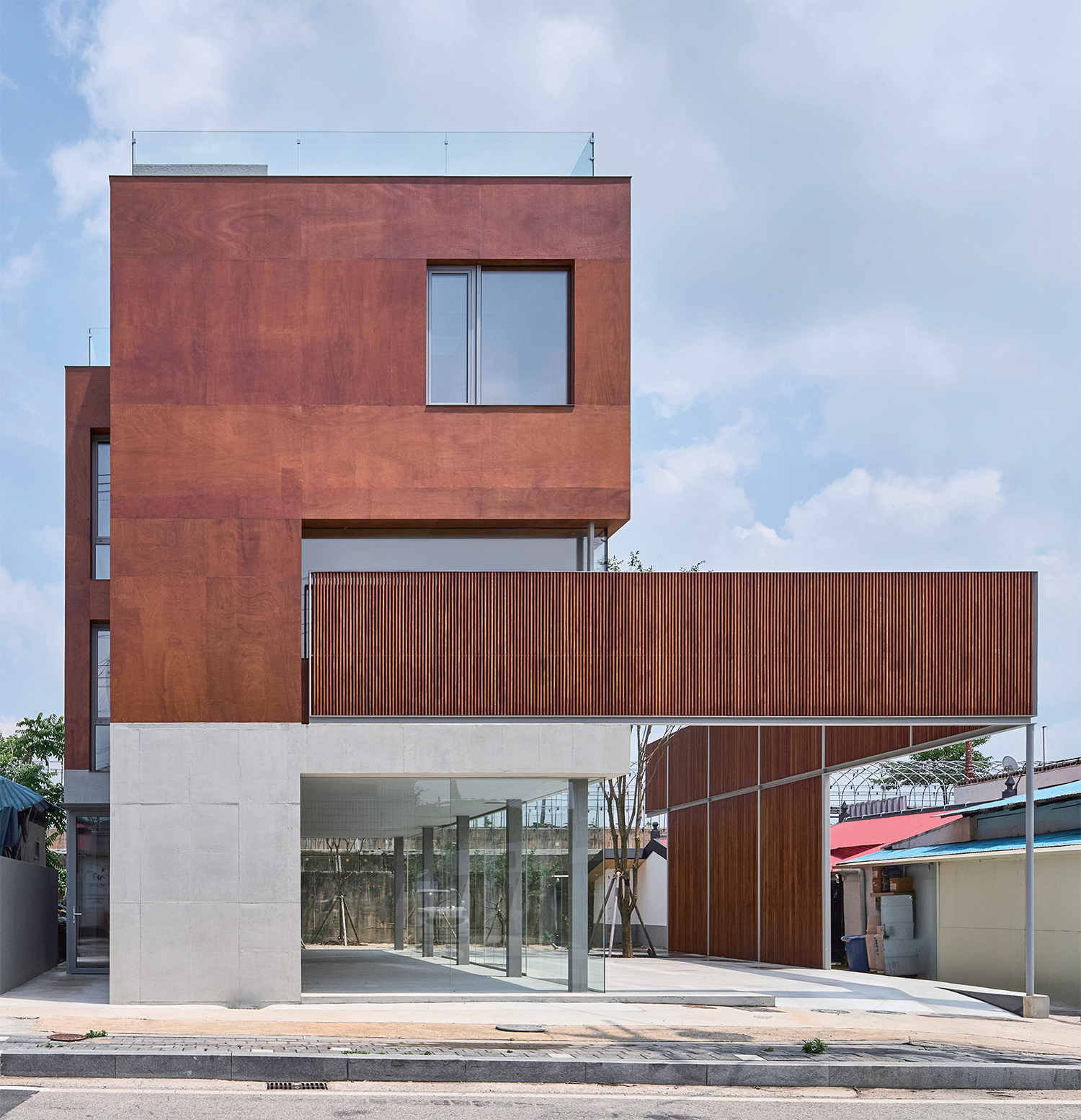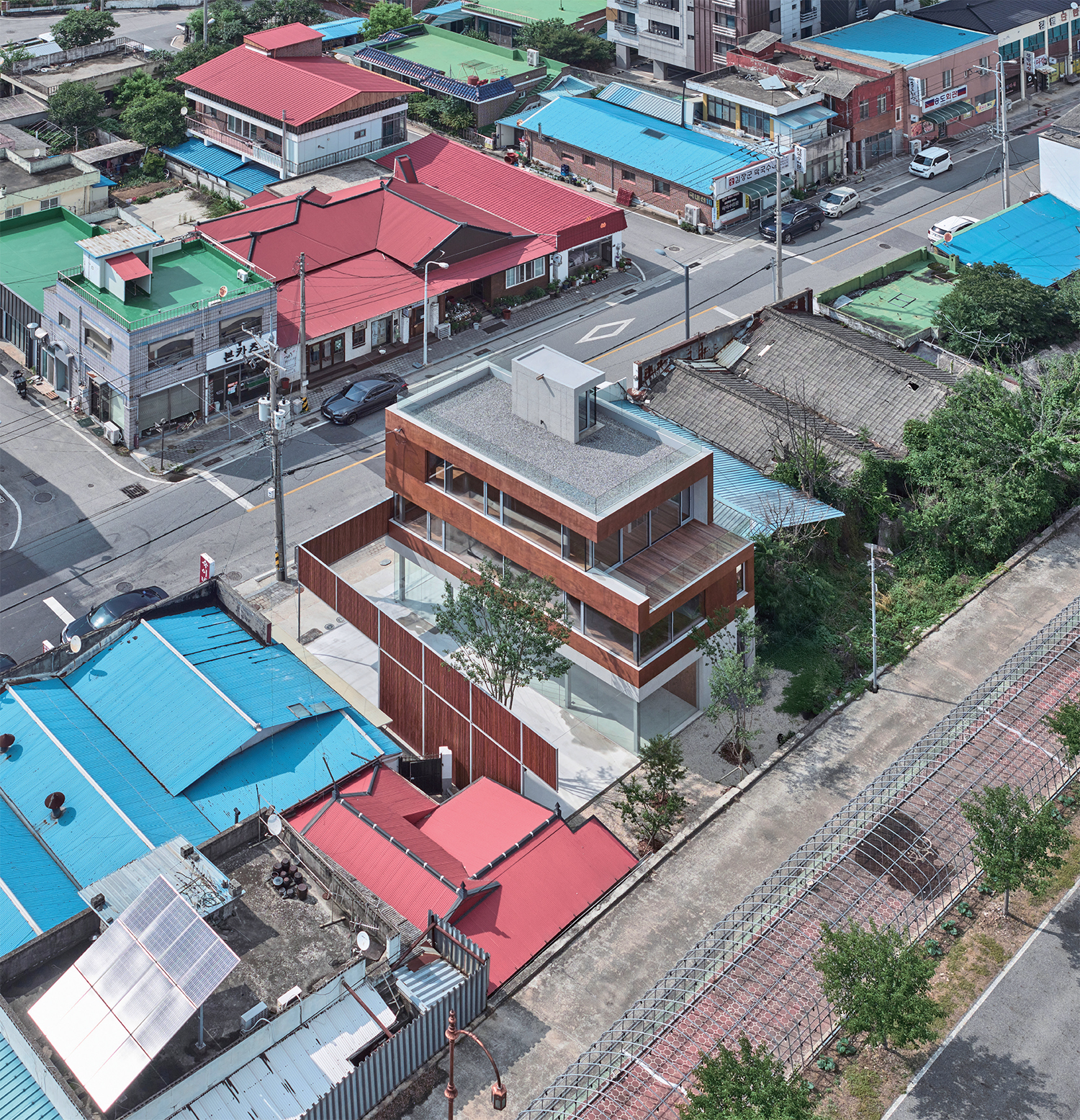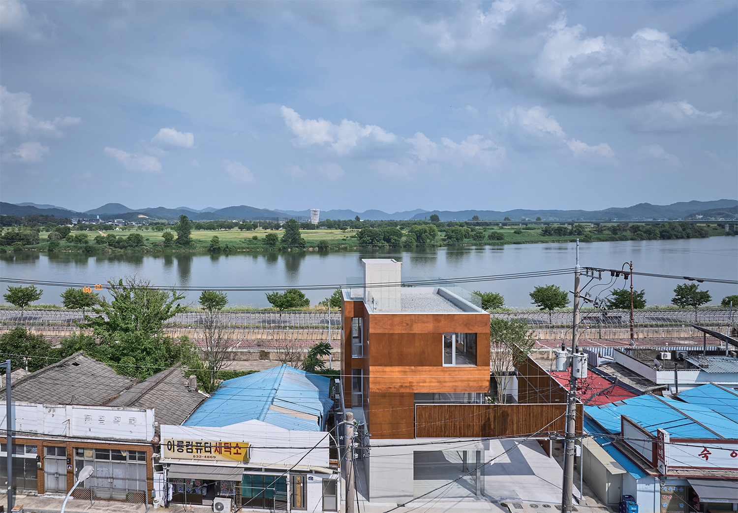 Gyuam Village is a riverside settlement situated along the Baekmagang River in Buyeo-gun, Chungcheongnam-do. In the past, this village thrived as a busy marketplace where boats would come and go through its ferry terminal. At one time, taverns, theatres, and inns lined its streets. However, the village began to decline in 1968 with the construction of the Baekjegyo Bridge. As overland transportation developed, commercial activity shifted across the river to Buyeo-eup, and many residents gradually left. Today, it is a quiet village. Around seven or eight years ago, both public and private agents began making efforts to revitalise the village. Their initiatives consistently focused on the theme of ¡®craft¡¯. However, after observing these efforts over several years, it appears that regeneration has not quite found its footing. It was in this context that I was commissioned to design a mixed-use building – part commercial space, part weekend residence – to contribute to the ongoing regeneration of the village.