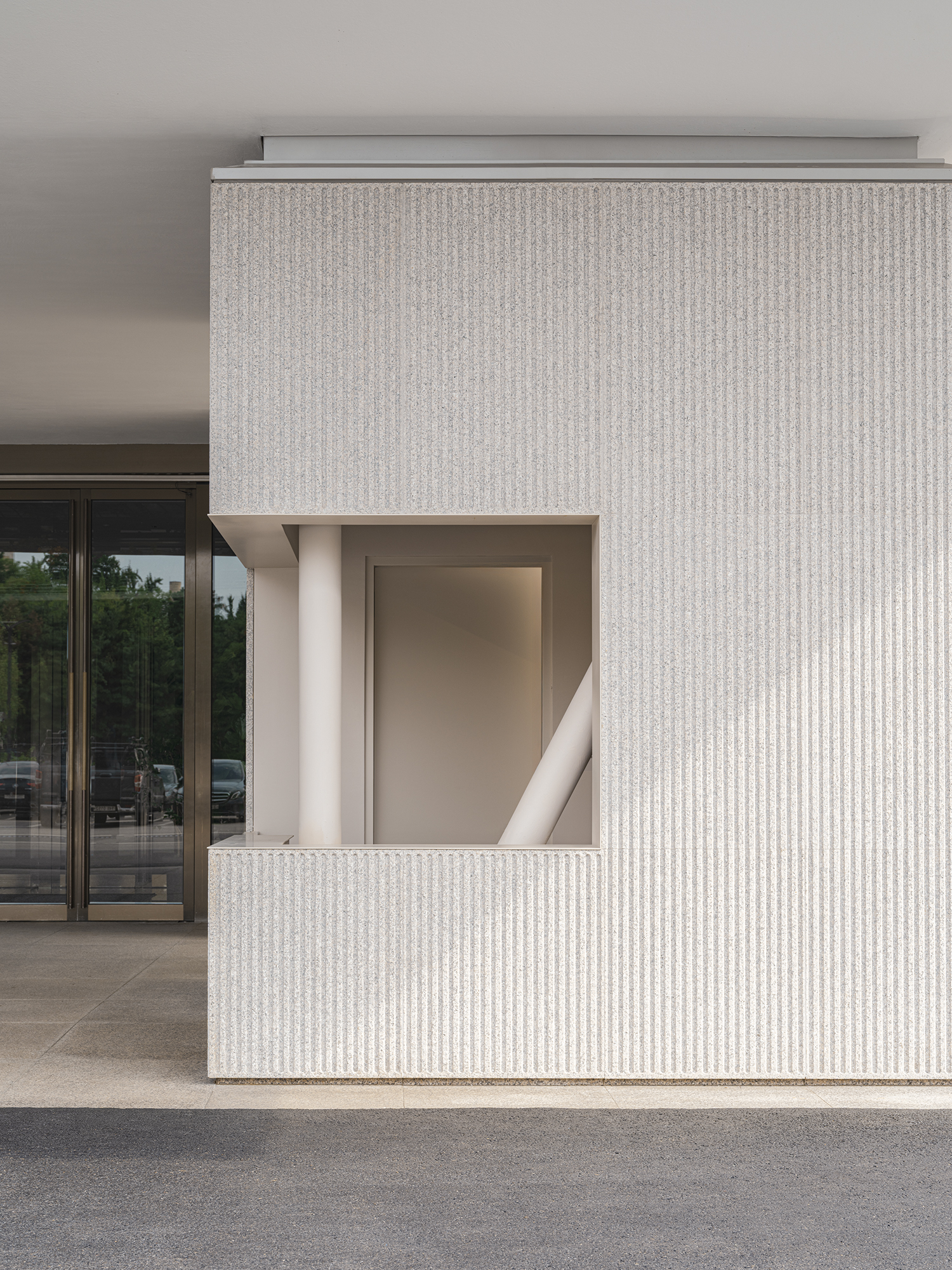 Beneath the extension lies an underground food hall and parking garage, leaving almost no structural margin. Steel columns have also been positioned like acupuncture needles, placed precisely atop the existing underground pillars. The walls of the valet lounge and booths under the canopy were finished with Moon Kyung stone, engraved in stripes to seep naturally into the building¡¯s original finish. Though it may appear as a simple, small space, it was meticulously designed to accommodate the brief moments of exchange – stepping out of a car, handling over the keys, returning to a waiting vehicle – so that gestures of welcome, farewell, courtesy, and gratitude, could unfold smoothly and without interruption.