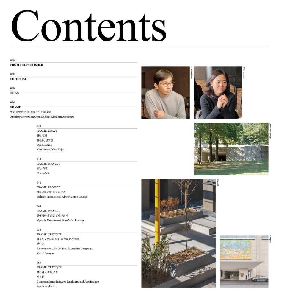 At the same time, we will not neglect our responsibility to seek out architecture that shatters the horizon of the contemporary by delineating its own piercing, distinctive paths. In this spirit, the FRAME section of this issue presents three projects by KimNam Architects (Co-Principals, Kim Jinhyu, Nam Hojin)—Hoam Cafe, Incheon International Airport Cargo Lounge, and Hyundai Department Store Valet Lounge. As Mihn Hyunjun (Professor, Hongik University) puts it, these works may at first glance appear trivial or minor, yet they propose a methodology that has the potential to be expanded to larger-scale architectural thinking.