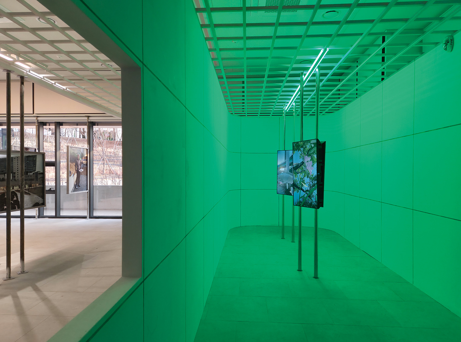 The exhibition of construction records titled ¡®Mnene Topos¡¯¡å1 is an archival project that reflects on the museum¡¯s building process and retraces the temporal narrative and memory of Seoul¡¯s southwestern region. Five artists (teams) that work across media such as photography, video, and augmented reality participated in this exhibition. The exhibition begins inside Studio 1 (which is located at the end of a narrow corridor in the lobby on the first floor) and, by utilising the museum¡¯s interstitial space, extends into the outdoor area. The first space to be encountered is a brightly green-lit room of moving images (augmented reality) designed by Shin Jisun. The artist drew upon the history of Seoul¡¯s southwestern region – which has undergone transformations such as the conversion of rural areas into urban industrial zones, the restoration of the Anyangcheon Stream, the development of G-Valley, and the construction of large-scale apartment complexes – as well as the memories of its past inhabitants. Seoseoulpedia, which is a five-part series, focused on the ecological environment – such as the mountains that have steadfastly held their ground amid the rapidly changing urban landscape, the fish that returned after the restoration of the once-polluted Anyangcheon Stream, and the trees that protected the village – while also reconstructing the narrative of an individual who lived in the neighbourhood via a mockumentary. The photographic works of Kim Taedong and VNR¡å2 are presented in the adjacent space separated by a single wall. Kim Taedong not only documented each phase of the construction process of the museum building via photographs but also displayed large-scale portraits of the workers involved in the project to disclose the narrative of labour accumulated within the museum. One distinctive feature of this exhibition space is that it has been partitioned using temporary construction structures, enhancing the sense of being on-site.