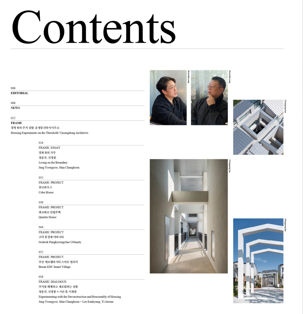 Housing has always been central to architectural thinking; the routes towards it, however, are multiple. In this issue¡¯s FRAME section, we examine contemporary approaches to the dwelling through the housing projects of Unsangdong Architects (hereinafter Unsangdong). Put differently, this is an attempt to read Unsangdong¡¯s architecture through housing of varied types and scales—such as single-family housing, rowhousing, and collective housing. One might question whether Unsangdong represents the forefront of housing design in Korea, or whether housing can be said to shape their practice as a whole. Given Unsangdong¡¯s persistent use of the term ¡®experiment¡¯ to describe its work, these projects repay closer scrutiny. Having met at Artech architects & partners (Principal, Kim Kwanseok), Jang Yoongyoo and Shin Changhoon have jointly steered Unsangdong since 2000. Occupying a distinctive position between the atelier and the large-scale office, they have consistently treated a wide range of housing types as objects of experimentation. In the realm of housing, however, for an experiment to be viable requires both strategic acuity and decisive action—qualities that can penetrate the narrow gaps within a reality shaped by dense regulations, ingrained conventions, and layered social desires. Even when unrealised, bold initiatives at the conceptual level tend to carry a critical stance towards reality. Moreover, given that solutions capable of transcending market logics are rarely achievable, even in response to long-standing issues widely acknowledged within the architectural profession, attempts to rethink housing inevitably assume the character of an experiment.