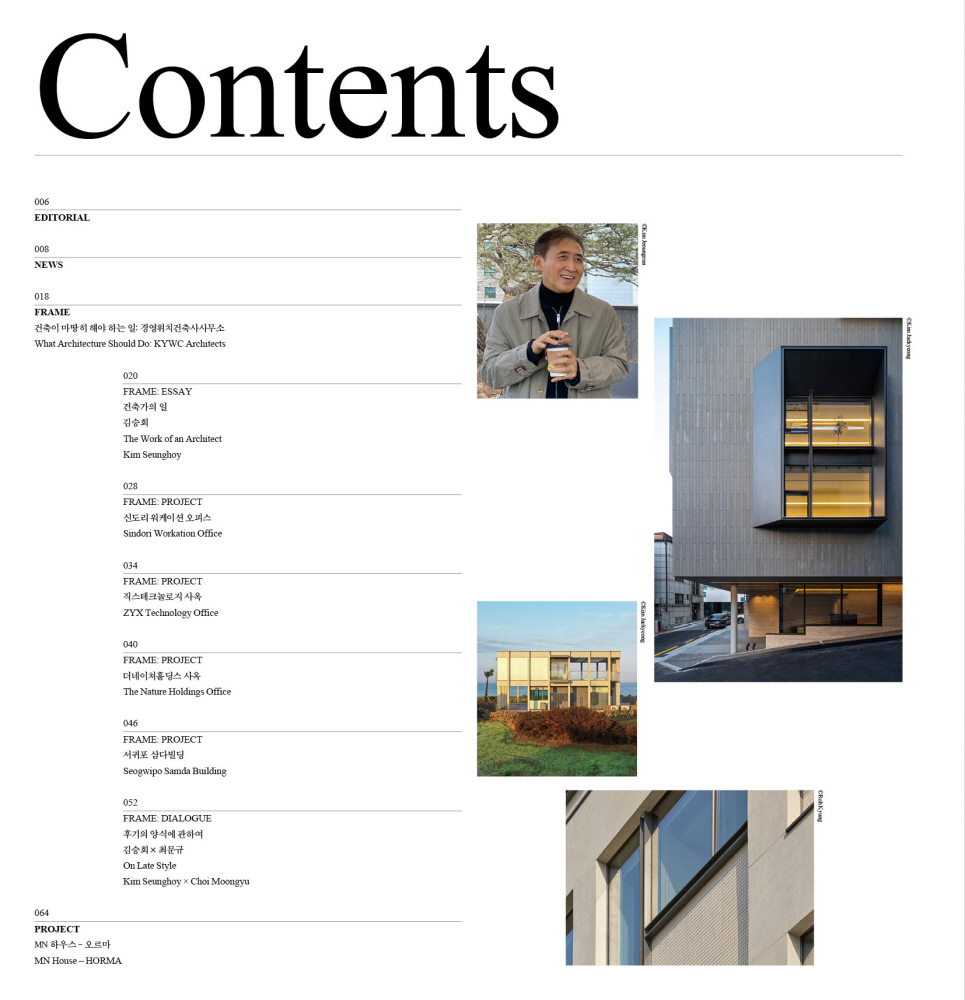 ¡®With this presentation, I feel I am finally saying everything I wanted to say to those I have mentored as architects.¡¯ These are the words of Kim Seunghoy (Principal, KYWC Architects) at the outset of this FRAME feature. For Kim, who describes himself as not particularly sociable, publishing work in architectural journals is his way of engaging with society. ¡®It is, in a sense, a trilogy.¡¯; in 2020, he discussed the depth of the surface as a boundary that forms the relationship between interior and exterior in architecture (¡®Depth of Surface, Potential of Space¡¯, covered in SPACE No. 632). In 2022, he turned to ¡®constructing¡¯ ‒ that is, tectonics ‒ where structure and the finish become a unified environment responding to the city and the street (¡®Construct ¡®Constructing¡¯¡¯, covered in SPACE No. 658).