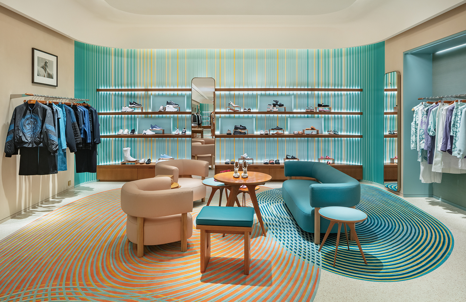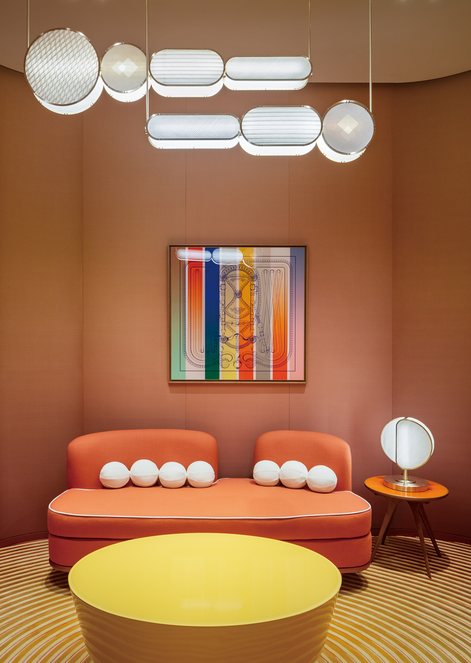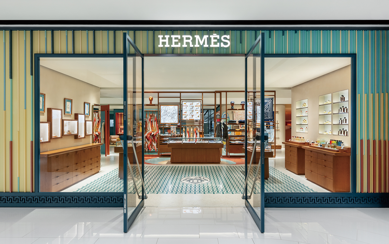 ¸ÅÀå¿¡ µé¾î¼¸é ¿¡¸£¸Þ½ºÀÇ ½Ã±×´ÏóÀÎ Å×¶óÁ¶ Æ÷ºÎ¸£ ÆÐÅϰú ¿¢½º-¸®ºê¸®½º(Ex-libris) ·Î°í°¡ ¹æ¹®°´À» ¸ÂÀÌÇϰí, ÆÐ¼Ç ÁÖ¾ó¸®¿Í Çâ¼ö Ä÷º¼ÇÀÌ ´«±æÀ» »ç·ÎÀâ´Â´Ù. ¸ÅÀå Áß°£¿¡´Â Ź Æ®ÀÎ °ø°£ÀÌ ÆîÃÄÁö¸ç, ½ÇÅ©°¡ Áß½ÉÀ» ÀÌ·é´Ù. ¿ìÃø¿¡´Â ´ëºñµÇ´Â »öÁ¶ÀÇ ½ºÆ®¶óÀÌÇÁ º®¸é°ú ¼öÀÛ¾÷À¸·Î Á¦ÀÛµÈ µ¿½É¿ø ÇüÅÂÀÇ ÅÍÇÁÆÃ Ä«ÆêÀ» ¹è°æÀ¸·Î ³²¼º ½´Áî¿Í ³²¼ºº¹ÀÌ Áø¿µÇ¾î ÀÖ´Ù. ½ÇÅ©·Î ²Ù¸çÁø °ø°£ µÚ·Î Ȩ Ä÷º¼Ç°ú ½Â¸¶ Ä÷º¼ÇÀÌ À̾îÁö¸ç, ÆÄ½ºÅÚ Åæ Å×¶óÁ¶·Î ¸¸µç °Å´ëÇÑ Á¶¾àµ¹ Çü»óÀÌ À̵éÀ» À¯±âÀûÀ¸·Î ¿¬°áÇÑ´Ù. Åë·Î¸¦ µû¶ó ¸ÅÀå ¾ÈÂÊÀ¸·Î µé¾î¼¸é ¿¡¸£¸Þ½ºÀÇ »ó¡ÀûÀÎ ±×·¹Å©(Grecques) Á¶¸íÀÌ °ø°£¿¡ ¸ôÀÔ°¨À» ´õÇϰí, ÀºÀºÇÏ°Ô ºû³ª´Â û·Ï»ö º®°ú ±×·¯µ¥ÀÌ¼Ç Ä«ÆêÀÌ °¨°¢ÀûÀÎ ºÐÀ§±â¸¦ ¿Ï¼ºÇÑ´Ù. ¾Æ´ÁÇÑ °ø°£ ÇÑÂÊ¿¡´Â °¡Á× Á¦Ç° Ä÷º¼ÇÀÌ, ¸ÂÀºÆí¿¡´Â ÁÖ¾ó¸®¿Í ¿öÄ¡ Ä÷º¼ÇÀÌ Áø¿µÇ¾î ÀÖ´Ù. ÇÁ¶óÀ̺ø »ì·ÕÀÌ ¸¶ÁÖÇÏ´Â ÀÌ °ø°£Àº ¸ÞÅ»¸¯ ¿ìµå ¸¶°¨ÀÇ º®¸éÀ¸·Î ¼¼·ÃµÈ ºÐÀ§±â¸¦ ´õÇÑ´Ù. ¿ìÃø¿¡´Â ¿©¼ºº¹ ¹× ½´Áî Ä÷º¼ÇÀÌ À̾îÁö¸ç, ¶Ç ´Ù¸¥ Á¶¾àµ¹ ¸ð¾çÀÇ Ä«ÆêÀº ÆÄ½ºÅÚ ºí·ç Å×¶óÁ¶ ¹Ù´Ú°ú ÀºÀºÇÑ ±¤ÅÃÀÇ ½ÇÅ© ÆÄƼ¼ÇÀÌ ¾î¿ì·¯Á®, Ä÷º¼ÇÀ» ´õ¿í µ¸º¸ÀÌ°Ô ÇÏ´Â Â÷ºÐÇÏ°í Æí¾ÈÇÑ ºÐÀ§±â¸¦ ÀھƳ½´Ù.