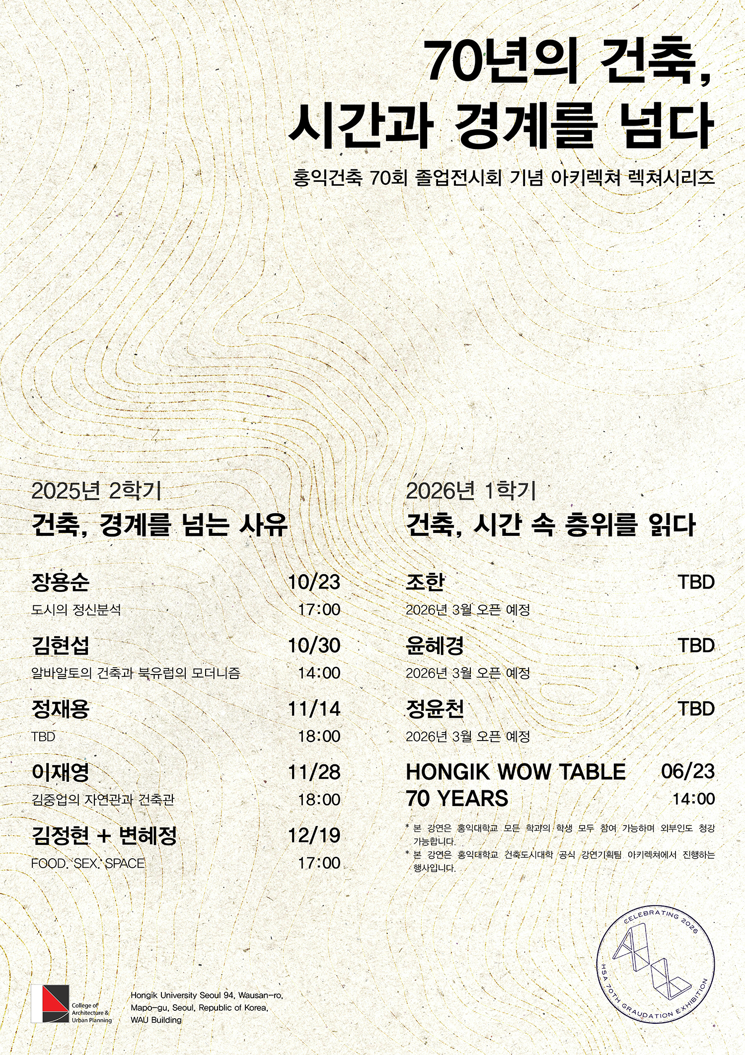È«ÀÍ´ëÇб³ °ÇÃ൵½Ã´ëÇÐ °ø½Ä °¿¬±âȹÇÐȸ ¾ÆÅ°·ºÃÄ´Â 2026³â È«ÀͰÇÃà Á¹¾÷Àü½Ã 70ÁÖ³âÀ» ±â³äÇÏ¿© ·ºÃ³ ½Ã¸®Áî '70³âÀÇ °ÇÃà, ½Ã°£°ú °æ°è¸¦ ³Ñ´Ù'¸¦ ±âȹÇß´Ù. ·ºÃ³ ½Ã¸®Á ÅëÇØ °ÇÃàÀ» ´Ü¼øÇÑ ¹°¸®Àû ±¸Ãà ÇàÀ§°¡ ¾Æ´Ñ, »çÀ¯¡¤¸Æ¶ô¡¤½Ã°£À̶ó´Â ¼¼ Ãà¿¡¼ ޱ¸Çϸç, ¿ª»ç¿Í Çö´ë, Àι®°ú °úÇÐ, ¹°Áú°ú ºñ¹°ÁúÀÇ °æ°è¸¦ ³Ñ³ªµå´Â °ÇÃà ´ã·ÐÀ» Çü¼ºÇϰíÀÚ ÇÑ´Ù.