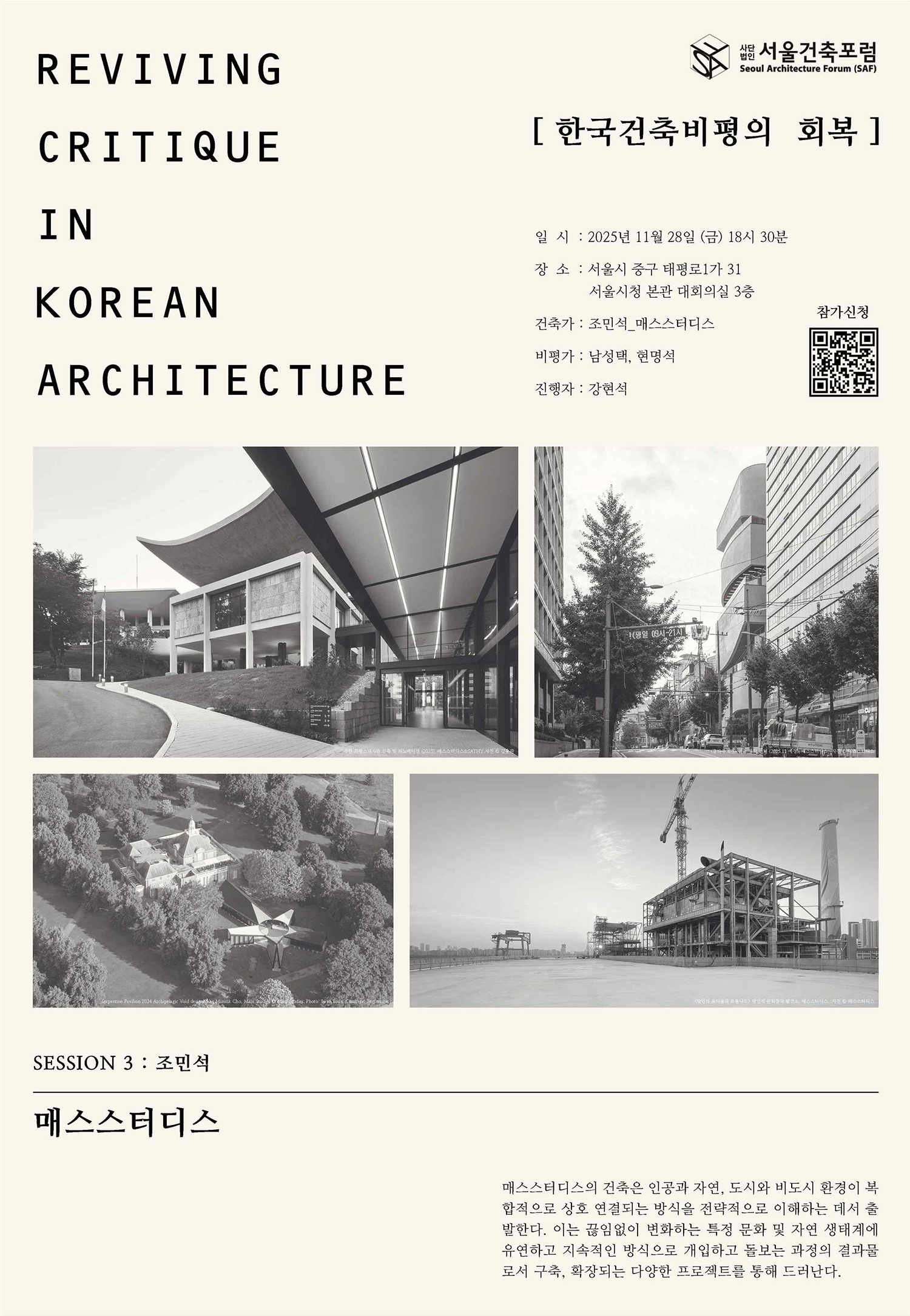 2025³â ½ÃÁð ÃÑ 4¹øÀÇ ¼¼¼Ç Áß ¼¼ ¹øÂ°·Î ÁøÇàµÇ´Â À̹ø ºñÆò ¼¼¼ÇÀº °ÇÃà°¡ Á¶¹Î¼®(¸Å½º½ºÅ͵𽺠´ëÇ¥)°ú ºñÆò°¡ ³²¼ºÅÃ, Çö¸í¼®°ú ÇÔ²²ÇÑ´Ù. Á¶¹Î¼® °ÇÃà ÀÛ¾÷À» '±ºµµ, º°ÀÚ¸®, °ÇÃàÀû Ç×ÇØ'¿Í '¹°·® ±×·¯³ª ºÎµå·¯¿î, °ø¼¼ ȤÀº ÈÄÅð'¿¡ ´ëÇÑ ÁÖÁ¦·Î »ìÆìº¸°í Çѱ¹ °ÇÃàÀÇ ÇöÀç¿Í °¡´É¼º¿¡ ´ëÇÑ ºñÆòÀÌ ÁøÇàµÈ´Ù. ºñÆò°¡µéÀº ºñÆò ´ë»óÀÎ °ÇÃàÀ» »çÀü ´ä»çÇϰí, °ÇÃà°¡ÀÇ ÀÛ¾÷°ú Ȱµ¿ ±×¸®°í ±ÛµéÀ» ¹ÙÅÁÀ¸·Î ½ÉµµÀÖ´Â ³»¿ëÀ» ´Ù°¢µµ·Î ºñÆòÇÒ ¿¹Á¤ÀÌ´Ù. »çÀü ½ÅûÀ» ÅëÇØ °ÇÃà ÀÛ¾÷¿¡ ´ëÇÑ ±Ã±ÝÇÑ Á¡À̳ª ºñÆò ³»¿ëÀ» Âü°¡ÀÚ°¡ ¹Ì¸® ÀüÇÒ ¼ö ÀÖ¾î ºñÆò°ú ÁøÇà¿¡ Âü¿©ÇÒ ¼ö ÀÖ´Â ¹æ¹ýµµ ¿·ÁÀÖ´Ù.
