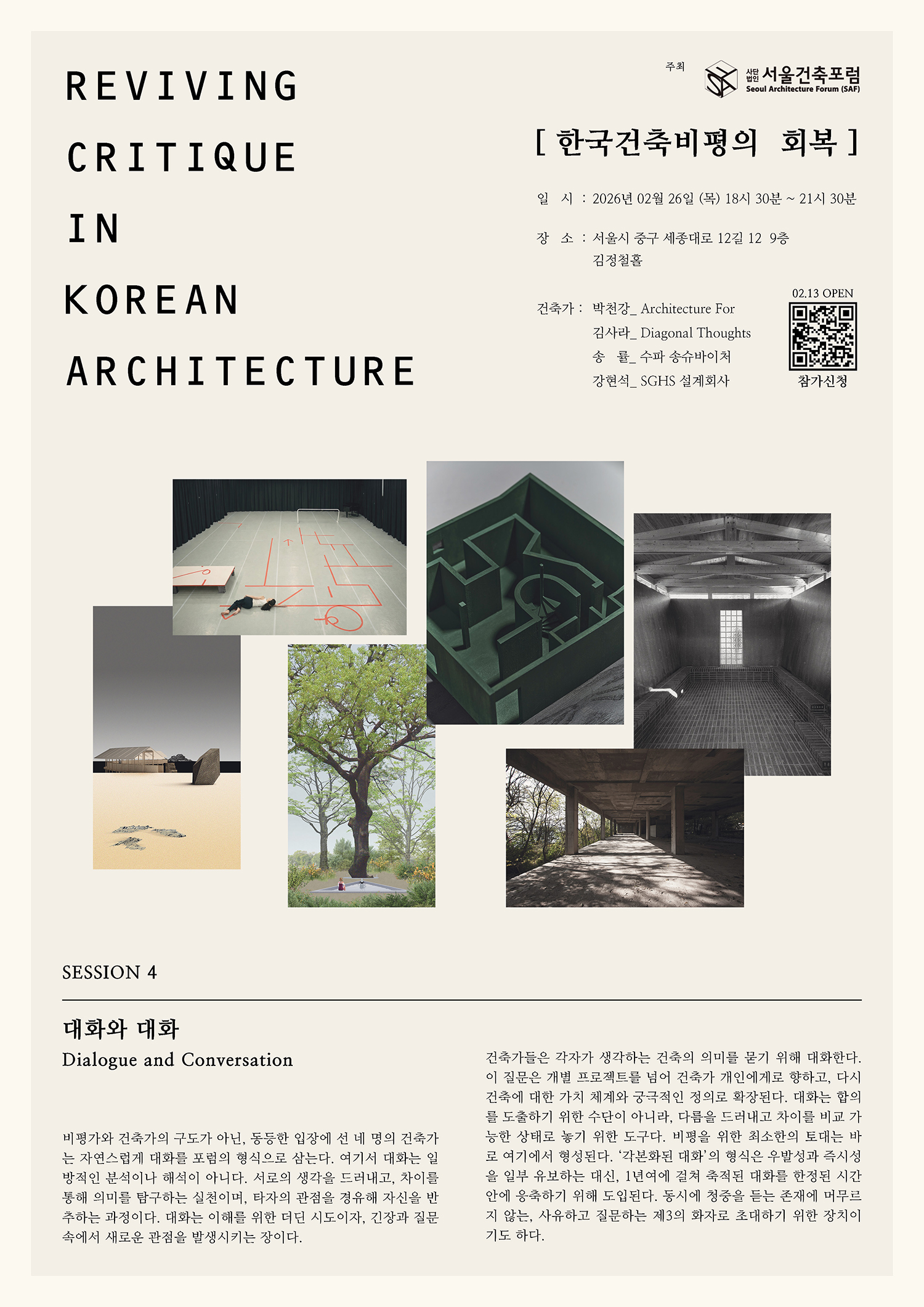 26ÀÏ¿¡ ÁøÇàµÇ´Â ³× ¹øÂ° ¼¼¼ÇÀº '´ëÈ¿Í ´ëÈ'¶ó´Â ÁÖÁ¦·Î ½ÅÁø°ÇÃà°¡ ±è»ç¶ó¿Í ¹Úõ°ÀÇ °ÇÃà ÀÛ¾÷À» »ìÆìº¸°í ºñ±³ÇÏ¿© Çѱ¹ °ÇÃàÀÇ ÇöÀç¿Í °¡´É¼º¿¡ ´ëÇÑ ºñÆòÀ» ÁøÇàÇÑ´Ù. ºñÆò°¡µéÀº ºñÆò´ë»óÀÎ °ÇÃàÀ» »çÀü´ä»çÇϰí, °ÇÃà°¡ÀÇ ÀÛ¾÷°ú Ȱµ¿ ±×¸®°í ±ÛµéÀ» ¹ÙÅÁÀ¸·Î ½ÉµµÀÖ´Â ³»¿ëÀ» ´Ù°¢µµ·Î ºñÆòÇÒ ¿¹Á¤ÀÌ´Ù. ±×µ¿¾È ½Ã°¢ÀÚ·á¿Í °ÇÃà°¡ÀÇ ¼³¸í°ú ÇØ¼³·Î¸¸ Á¢ÇÒ ¼ö ¹Û¿¡ ¾ø¾î¼ ±íÀÌ ÀÖ´Â °ÇÃà°ú °ø°£¿¡ ´ëÇÑ °¥ÁõÀÌ ÀÖ¾ú´ø Çѱ¹°ÇÃà°è¿¡ ÀǹÌÀÖ´Â ½Ã°£ÀÌ µÉ °ÍÀÌ´Ù. »çÀü½ÅûÀ» ÅëÇØ À̵éÀÇ °ÇÃàÀÛ¾÷¿¡ ´ëÇÑ ±Ã±ÝÇÑ Á¡À̳ª ºñÆò ³»¿ëÀ» Âü°¡ÀÚ°¡ ¹Ì¸® ÀüÇÒ ¼ö ÀÖ¾î ºñÆò°ú ÁøÇà¿¡ Âü¿©ÇÒ ¼ö ÀÖ´Â ¹æ¹ýµµ ¿·ÁÀÖ´Ù. À̹ø ¼¼¼ÇÀº ÀÛ³â 11¿ù °ÇÃà°¡ ¡®Á¶¹Î¼®¡¯ÀÇ °ÇÃ༼°è¸¦ ´Ù·é ¼¼ ¹øÂ° ¼¼¼Ç¿¡ ÀÌ¾î ³× ¹øÂ°´Ù. ´ÙÀ½ ¼¼¼ÇÀº studio_K_works ¡®±è±¤¼ö¡¯ °ÇÃà°¡¸¦ ´ë»óÀ¸·Î 5¿ù¿¡ ÁøÇ࿹Á¤ÀÌ´Ù.