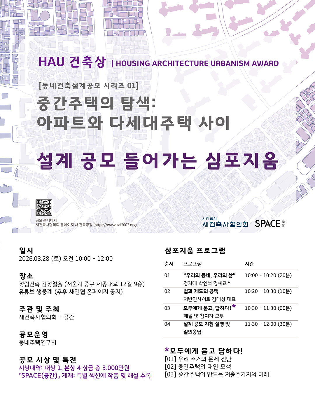 (»ç)»õ°ÇÃà»çÇùÀÇȸ¿Í ¿ù°£ SPACE°¡ °øµ¿ ÁÖÃÖÇÏ´Â µ¿³×°ÇÃà ¼³°è°ø¸ð ù ¹øÂ° ½Ã¸®Áî 'Áß°£ÁÖÅÃÀÇ Å½»ö: ¾ÆÆÄÆ®¿Í ´Ù¼¼´ëÁÖÅà »çÀÌ' ¿¬°è ½ÉÆ÷Áö¾öÀÌ ¿¸°´Ù. À̹ø ½ÉÆ÷Áö¾öÀº ¿À´Â 3¿ù 28ÀÏ(Åä) ¿ÀÀü 10½ÃºÎÅÍ Á¤¸²°ÇÃà ±èÁ¤Ã¶È¦¿¡¼ °³ÃֵȴÙ. »õ°ÇÃà»çÇùÀÇȸ À¯Æ©ºê ä³ÎÀ» ÅëÇÑ »ýÁß°èµµ ÇÔ²² ÁøÇàµÈ´Ù.