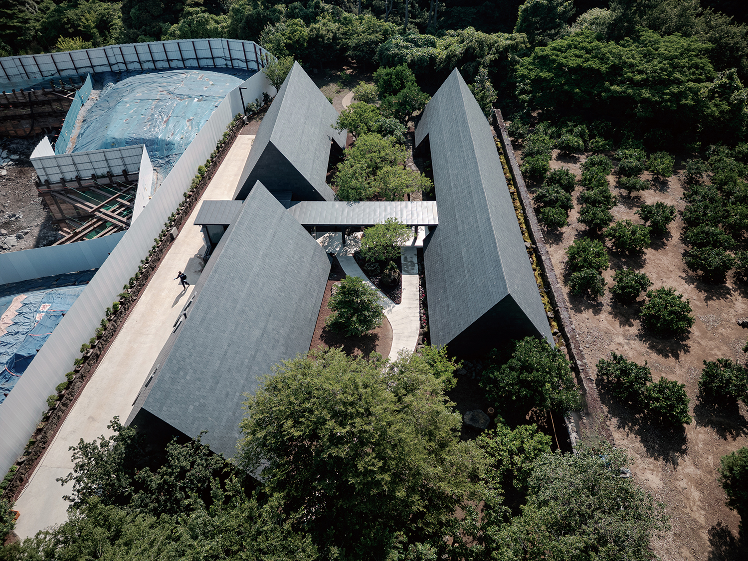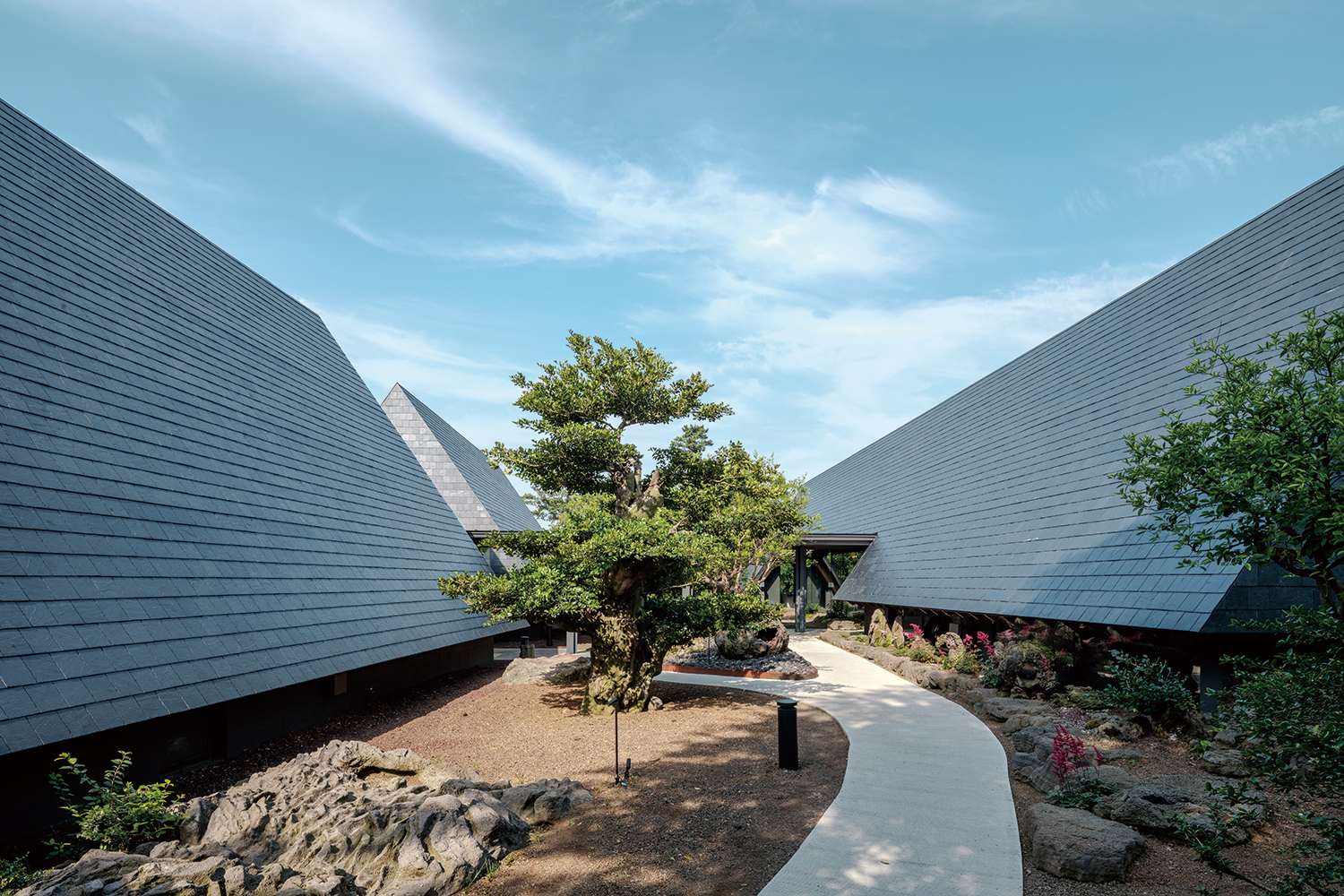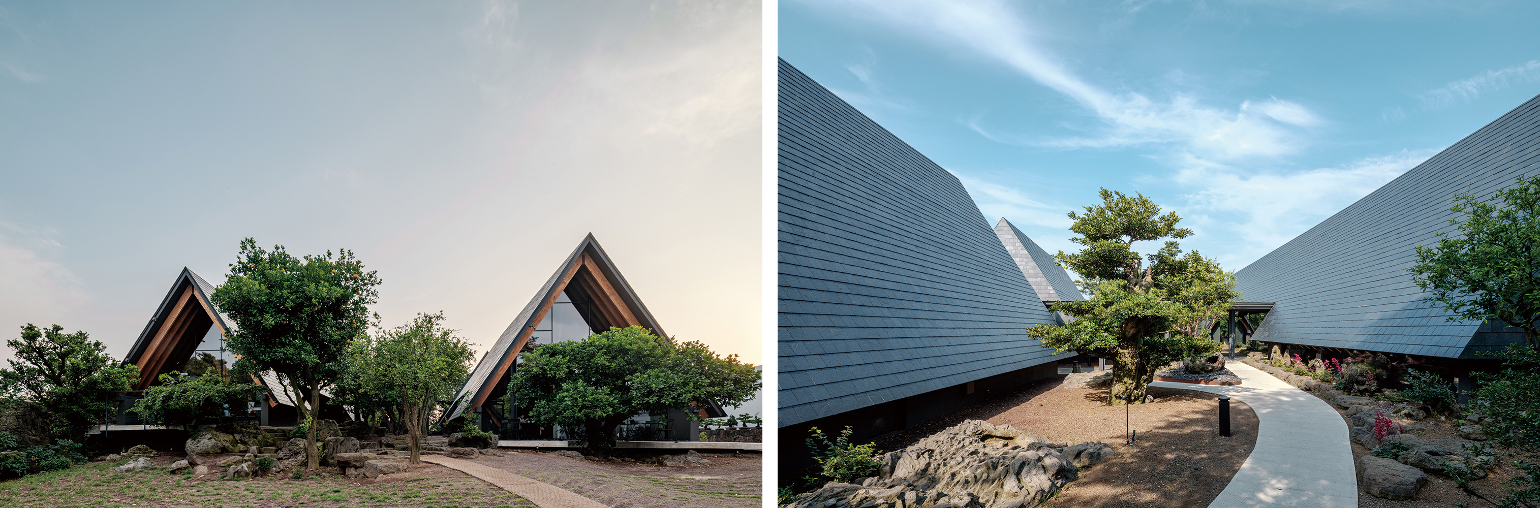 °Ç¹°ÀÇ ÇüÅ´ ÀǵµµÈ °á°úÀ̱⺸´Ù ´ëÁöÀÇ È帧¿¡ ´ëÇÑ ÀÀ´ä¿¡ °¡±õ´Ù. °ÇÃàÀÌ Àü¸é¿¡ µå·¯³ªÁö ¾Ê°í ¹è°æÀ¸·Î ¹°·¯¼¼ Á¶¿ëÈ÷ ÁÖº¯À» ǰ´Â ¸ð½ÀÀÌ´Ù. °¨ÃßµÇ µå·¯³»´Â ¹æ½Ä, ÀýÁ¦ ¼ÓÀÇ ±íÀ̰¡ ÇÙ½ÉÀ̾ú´Ù. µ¿¼·Î ±ä ¼±Çü ´ëÁöÀÇ ÃàÀ» µû¶ó °Ç¹°À» ±æ°Ô ¹èÄ¡Çß´Ù. ¹Ú°øÁöºØÀÇ °æ»ç´Â ÇÑõÀ¸·Î È帣´Â °ø±â ±æÀ» µû¸£¸ç, ±íÀº 󸶴 ³²ÃøÀÇ °·ÄÇÑ Àϻ縦 °É·¯³½´Ù. ´ëÁö¸¦ °¨½Î°í ÀÖ´Â µ¹´ã ³ôÀÌ(¾à 90cm)¿¡ ¸ÂÃç ³·°Ô ³»·Á¿À´Â 󸶼±Àº Ä«Æä ¾È¿¡ ¾É¾ÒÀ» ¶§ ½Ã¼±ÀÌ ÀÚ¿¬½º·´°Ô ¾Æ·¡·Î ÇâÇϵµ·Ï ÇÑ´Ù. ÀÌ ³·Àº ´«³ôÀÌ´Â ³»ºÎ °ø°£¿¡¼ ¹Ù±ù dz°æÀ» Çѹø¿¡ ¹Þ¾ÆµéÀ̱⺸´Ù µ¹´ã ¾Æ·¡ÀÇ Èë°ú ½Ä»ý, ºûÀÇ Èçµé¸²¿¡ ÁýÁßÇϵµ·Ï À¯µµÇÑ´Ù. ¹Ý´ë·Î Çϴ÷Π»ó½ÂÇÏ´Â »ï°¢Çü ´Ü¸éÀÇ ÁöºØ¼±Àº ÁßÁ¤¿¡¼ Çϴ÷Π¿¸®´Â Á¶¸ÁÀ» È®º¸Çϸ鼵µ ºÏÃøÀÇ ¾ÆÆÄÆ® ´ÜÁö¿Í ³²ÃøÀÇ ºñ´ÒÇϿ콺°¡ ½Ã¾ß¿¡ µé¾î¿ÀÁö ¾Êµµ·Ï ¼¶¼¼ÇÏ°Ô Á¶Á¤µÇ¾ú´Ù. ¿ÜÇÇ ¿ª½Ã µÎµå·¯ÁöÁö ¾Ê°í ÁÖº¯°ú ¾î¿ì·¯Áöµµ·Ï Á¦ÁÖ Æ¯À¯ÀÇ Åä»öÀ» Áö´Ñ ³·Àº äµµÀÇ Ãµ¿¬ ½½·¹ÀÌÆ®·Î ÁöºØÀ» ¸¶°¨Çß´Ù. ÀÌó·³ ÁöºØ¼±°ú ó¸¶, ´Ü¸éÀÇ °¢µµ´Â ´ëÁöÀÇ È帧°ú »ç¶÷ÀÇ ½Ã¼±À» µ¿½Ã¿¡ Àо´Â °ÇÃàÀû ÀåÄ¡·Î ÀÛµ¿ÇÑ´Ù.