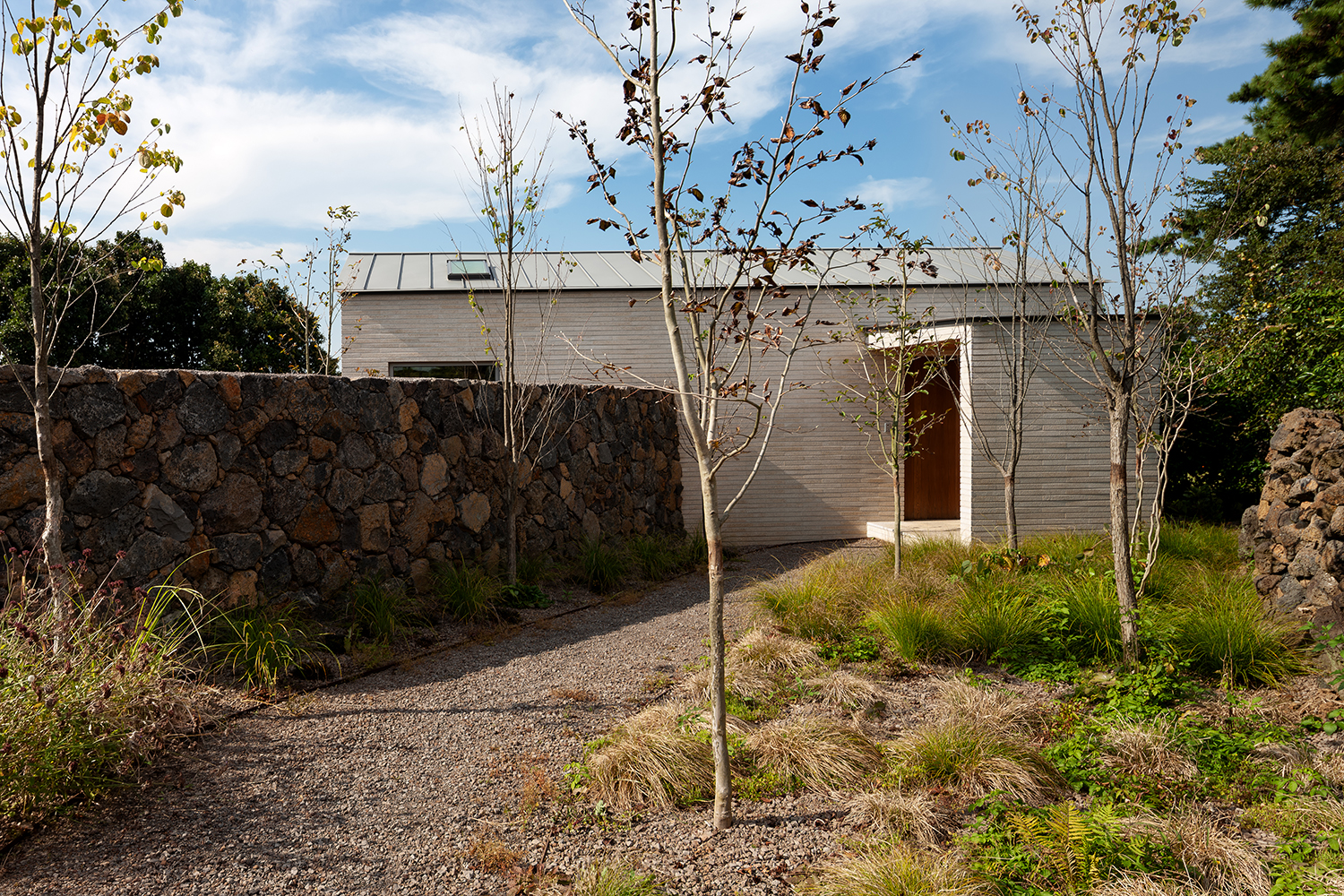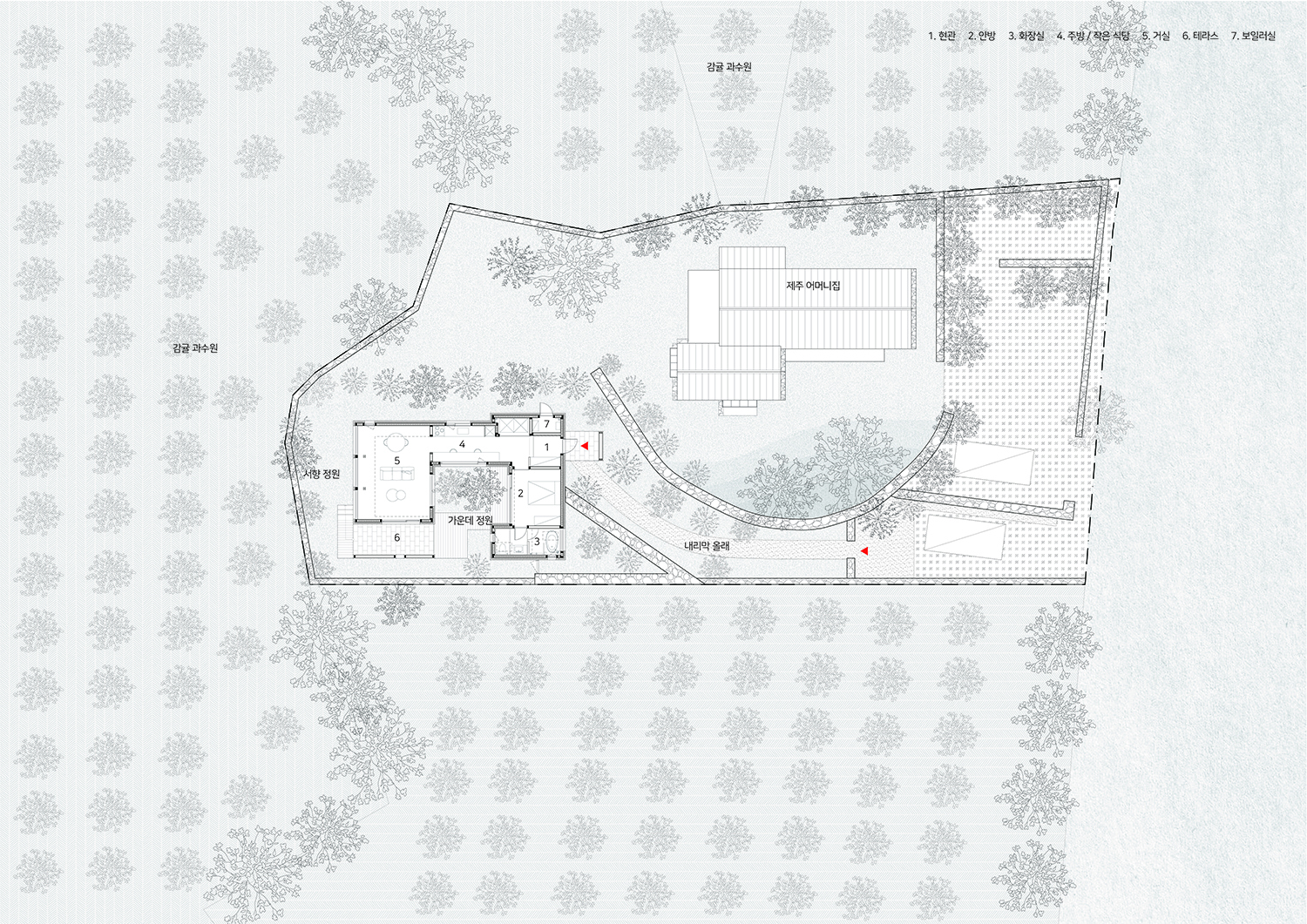 ¹°ºüÁüÀÌ ÁÁÀº Á¦ÁÖ´Â ¶¥À» ±¸Å¿© ³ôÀÌÁö ¾Ê°í, °Ç¹°°ú ¼ö¸ñ, ´ãÀåÀ¸·Î °ÇÑ ¹Ù¶÷À» ¸·¾Æ µû¶æÇÑ ¸¶´çÀ» ¸¸µç´Ù. ¹°º¸´Ù ¹«¼¿î °ÍÀÌ ¹Ù¶÷ÀÎ °ÍÀÌ´Ù. Á¦ÁÖ ÀÛÀº ÁýÀº µµ·Î¿¡¼ºÎÅÍ Á¡Á¡ ³·¾ÆÁö´Â ¿Ã·¡¸¦ µû¶ó ±í °Ô µé¾î¿À¸é ¸¸³ª°Ô µÇ´Â ÁýÀÌ´Ù. ¿ì¸®´Â ¶¥ÀÇ ±âÁ¸ ¸ð½ÀÀ» ±×´ë·Î À¯ÁöÇϸç, ¼ö¸ñ°ú µ¹´ãÀ» µÎ¸¥ ÈÄ ±×¿¡ ¾î¿ï ¸®´Â ¤§ÀÚ ¸ð¾çÀÇ ´ÜÁ¤ÇÑ ÁýÀ» °èȹÇÏ¿´´Ù.
