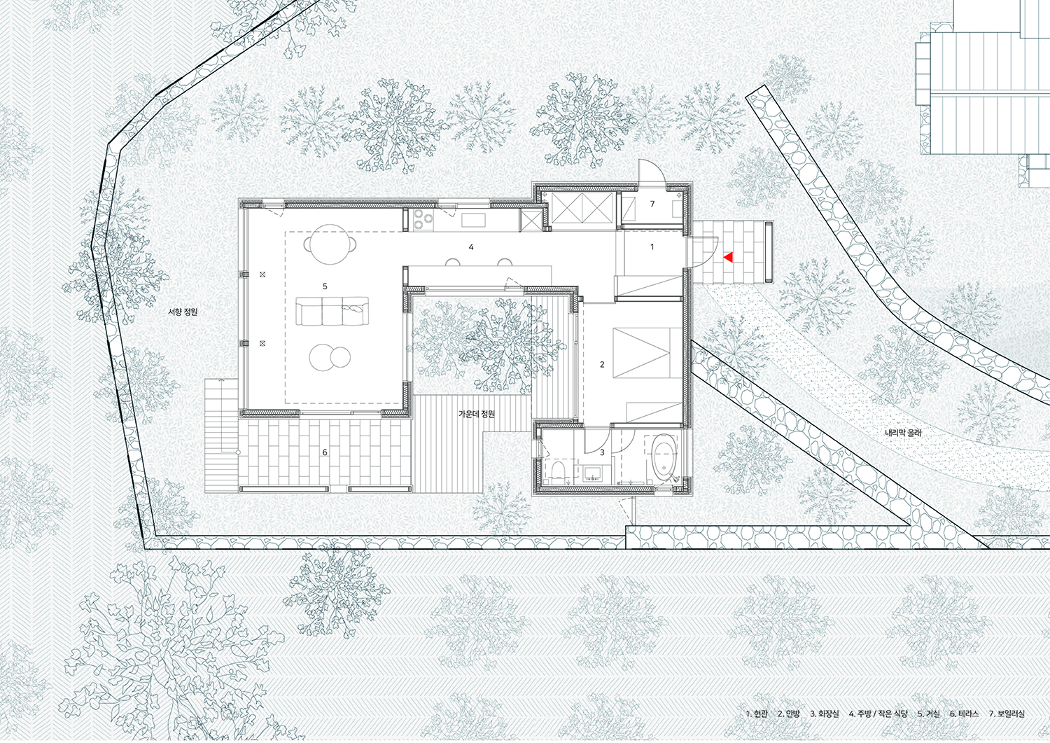 ¿ì¸®´Â ¹æ°ú ¿ÜºÎ¸¦ ´ÜÀýÇÏ´Â º¹µµ¸¦ µÎÁö ¾Ê´Â °ÍÀÌ ÇÑ¿ÁÀÇ Áß¿äÇÑ °³³ä Áß Çϳª¶ó´Â »ý°¢À» °¡Áö°í ÀÖ´Ù. ÀÌ ÁýÀ» °èȹÇÒ ¶§, Á¦ ¿ªÇÒ¿¡ Ãæ½ÇÇÑ ÇϳªÇϳªÀÇ °ø°£µéÀ» °èȹÇÏ°í ¹æ°ú °Å½ÇÀÇ Áß°£ ¿µ¿ª¿¡ °£ÇæÀûÀ¸·Î »ç¿ëÇÏ´Â ÁÖ¹æ°ú °£´ÜÈ÷ ½Ä»ç¸¦ ÇÒ ¼ö ÀÖ´Â ÀÛÀº ½ÄŹÀ» µÎ¾î ±×°÷¿¡¼ ¹Ù¶óº¸´Â ¸¶´çÀ» µÎ´Â °ÍÀ¸·Î ±× °³³äÀ» À̾°í ½Í¾ú´Ù. ±×°á°ú ¹æ°ú ÈÀå½Ç-ÁÖ¹æ-°Å½Ç·Î À¯·ÁÇÏ°Ô ¿¬°áµÈ ÁýÀº ¸ðµç ¸é¿¡¼ ¿ÜºÎ¿Í ¼ÒÅëÇÏ´Â ÇÑ¿Á°úµµ ´à¾ÆÀÖ´Ù.