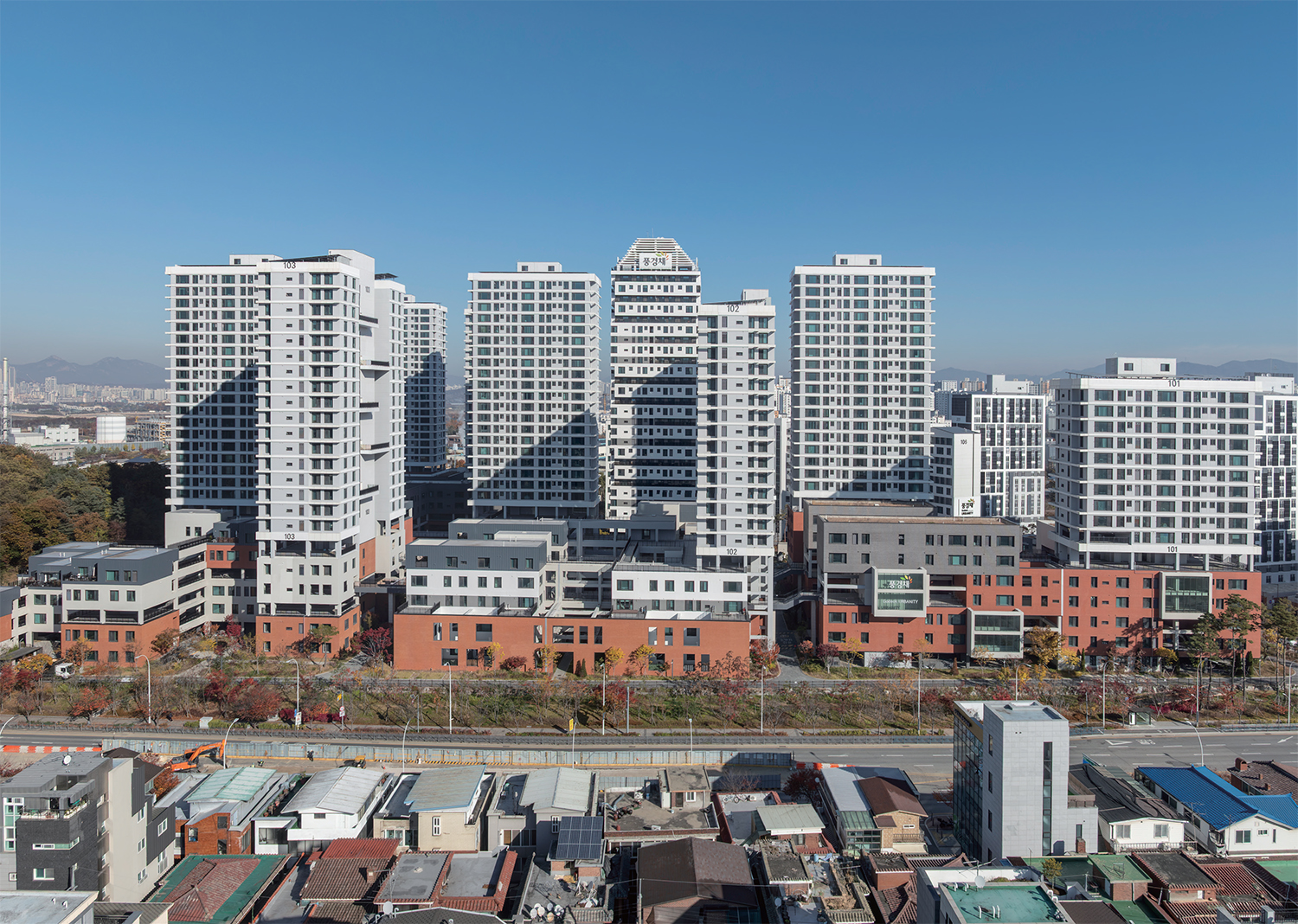 Æó¼âÀûÀÎ ´ë´ÜÁö ½ºÄÉÀÏ ´ë½Å, ÁÖº¯ »óȲÀ» °í·ÁÇØ ´Ù¼¸ °³ ºí·ÏÀ¸·Î ³ª´« ÀúÃþºÎÀÇ ´Ù¼¸ ¸¶À»Àº ¸ðµÎ Æ¯ÈµÈ ÁÖ°Å À¯´Ö°ú ¿ÜºÎ °ø°£À» °¡Áø´Ù. ´Ù¼¸ °³ÀÇ ¼·Î ´Ù¸¥ ¸¶À»Àº ºê¸®Áö¸¦ ÅëÇØ 3¡¤4Ãþ¿¡¼ ¼·Î ¿¬°áµÇ¸ç ¡®Â÷ÀÌÀÇ °øµ¿Ã¼¡¯¸¦ Çü¼ºÇÑ´Ù. ¸¶À»°ú ¸¶À», Áý°ú Áý »çÀÌ¿¡´Â Ä¿¹Â´ÏƼ °¡·Î, ¿Á»óÁ¤¿ø, 3¡¤5ÃþÀÇ Ä¿¹Â´ÏƼ ½Ã¼³°ú ¿ÀǽºÆäÀ̽º µî ÈÞ¸Õ ½ºÄÉÀÏÀÇ °øÀ¯ °ø°£ÀÌ Á¶Á÷ÀûÀ¸·Î ¹èÄ¡µÇ¾î °øµ¿Ã¼ Ȱµ¿À» À¯µµÇϰí, ¸¶À» Àüü¸¦ ÇϳªÀÇ À¯±âÀû ü°è·Î ¸¸µç...