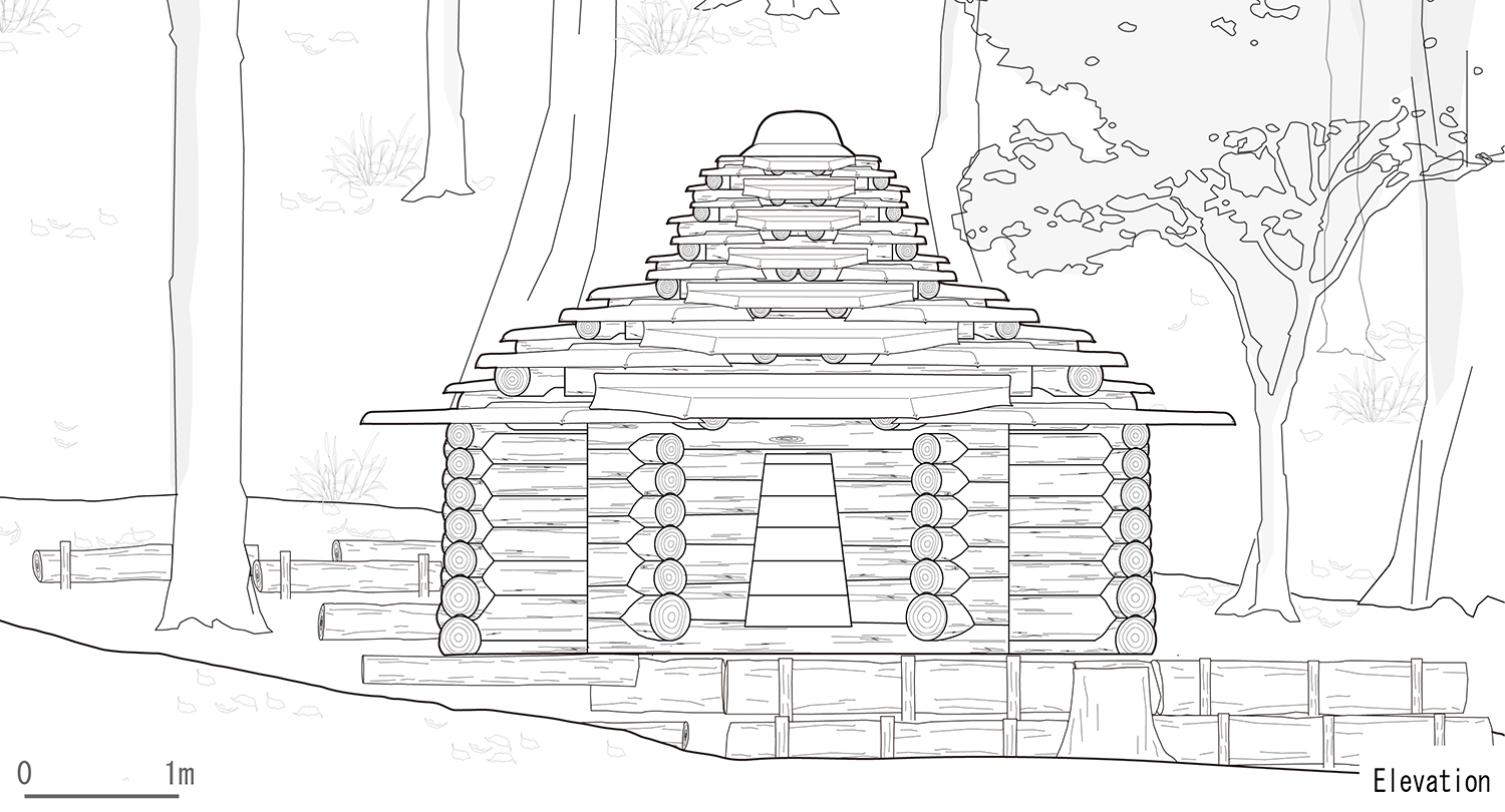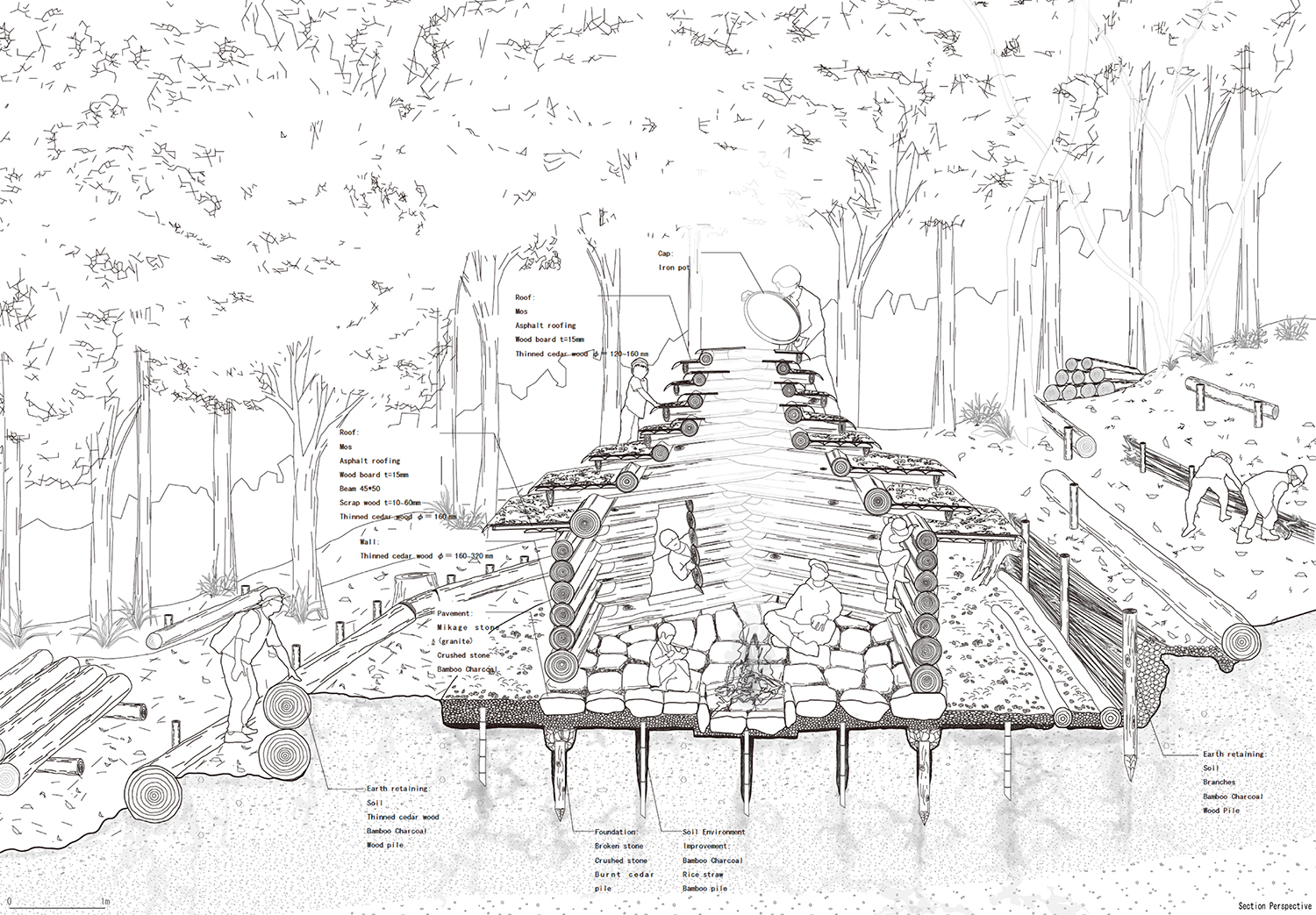 ¸ñ·Î¾Ï¿¡ »ç¿ëµÈ Àç·á´Â ÀÌ °úÁ¤¿¡¼ ¹ß»ýÇÑ °£¹úÀç¿Í ¾²·¯Áø ³ª¹«¿´´Ù. ¹ú·¹ ¸ÔÀº ¾²·¯Áø ³ª¹«´Â Åä»ç À¯½ÇÀ» ¸·´Â È븷À̳ª ¸»¶Ò ±×¸®°í µî»ê·Î °è´ÜÀÇ Àç·á·Î »ç¿ëµÇ¾ú°í, ÇÞºûÀÌ µéÁö ¾Ê¾Æ ´ÜÀÏ ¼öÁ¾ÀÌ Áö¹èÇÏ´ø ´ç½ÃÀÇ ½£¼Ó ȯ°æÀ» ÇØ¼ÒÇϱâ À§ÇØ °£¹úÇÑ »ï³ª¹«´Â üÀÎÅéÀ¸·Î ´Ùµë¾î ½×¾Æ ¿Ã¸®´Â ·Î±×ÇϿ콺 ±¸Á¶ÀÇ °ÇÃà Àç·á°¡ µÇ¾ú´Ù. ½£ ¾È¿¡ ÁßÀåºñ¸¦ µéÀÏ ¼ö ¾ø¾ú±â ¶§¹®¿¡, ¸ðµç Àç·á´Â »ç¶÷ÀÇ ¸öÀ¸·Î Á÷Á¢ ´Ù·ï¾ß Çß´Ù. µÎ¼¼ »ç¶÷ÀÌ ¿î¹ÝÇÒ ¼ö ÀÖ´Â Å볪¹«ÀÇ ÃÖ´ë ±æÀÌ´Â ¾à 3¹ÌÅÍ¿´°í, Å볪¹«¸¦ ¼·Î °É¾î ½×À» ¶§ ÇÊ¿äÇÑ °ãħ ±æÀ̸¦ °í·ÁÇϸé, ´Ü¼øÇÑ »ç°¢ÇüÀÇ Á÷±³ ±¸Á¶·Î´Â ³»ºÎ °ø°£ÀÌ Áö³ªÄ¡°Ô Çù¼ÒÇØÁö±â ¸¶·ÃÀ̾ú´Ù. ÀÌ·¯ÇÑ ÇöÀåÀÇ ÀÛ¾÷ Á¶°ÇÀ» ¹ÙÅÁÀ¸·Î Æò¸éÀº Á¤À°°¢ÇüÀ¸·Î È®ÀåµÇ¾ú°í, ±× °á°ú ¾à 9§³ ±Ô¸ðÀÇ ³»ºÎ °ø°£ÀÌ Çü¼ºµÇ¾ú´Ù. ÀÌ ±âÇÏÇÐÀº °³³äÀûÀ¸·Î ¼±ÅÃµÈ ±âÇÏÀû ÇüŰ¡ ¾Æ´Ï¶ó, ½£¿¡¼ Á¢±Ù°¡´ÉÇÑ Àç·áÀÇ Å©±â¿Í ¹«°Ô, ½Ã°øÀÇ ¿ëÀ̼º, ¸öÀÇ ½ºÄÉÀÏ¿¡ ÀÇÇØ ÆÄ»ýµÇ¾ú´Ù. µû¶ó¼, ÀÌ´Â Àΰ£ÀÇ ½Åü¿Í ÀÚ¿¬À¸·Î¸¸ µÑ·¯½ÎÀÎ ÁÖº¯ ¸Æ¶ô¿¡ ´ëÇÑ °£°áÇÏ°í ¸íÄèÇÑ °ÇÃàÀû ÀÀ´äÀ̶ó°í ÇÒ ¼ö ÀÖ¾ú´Ù.