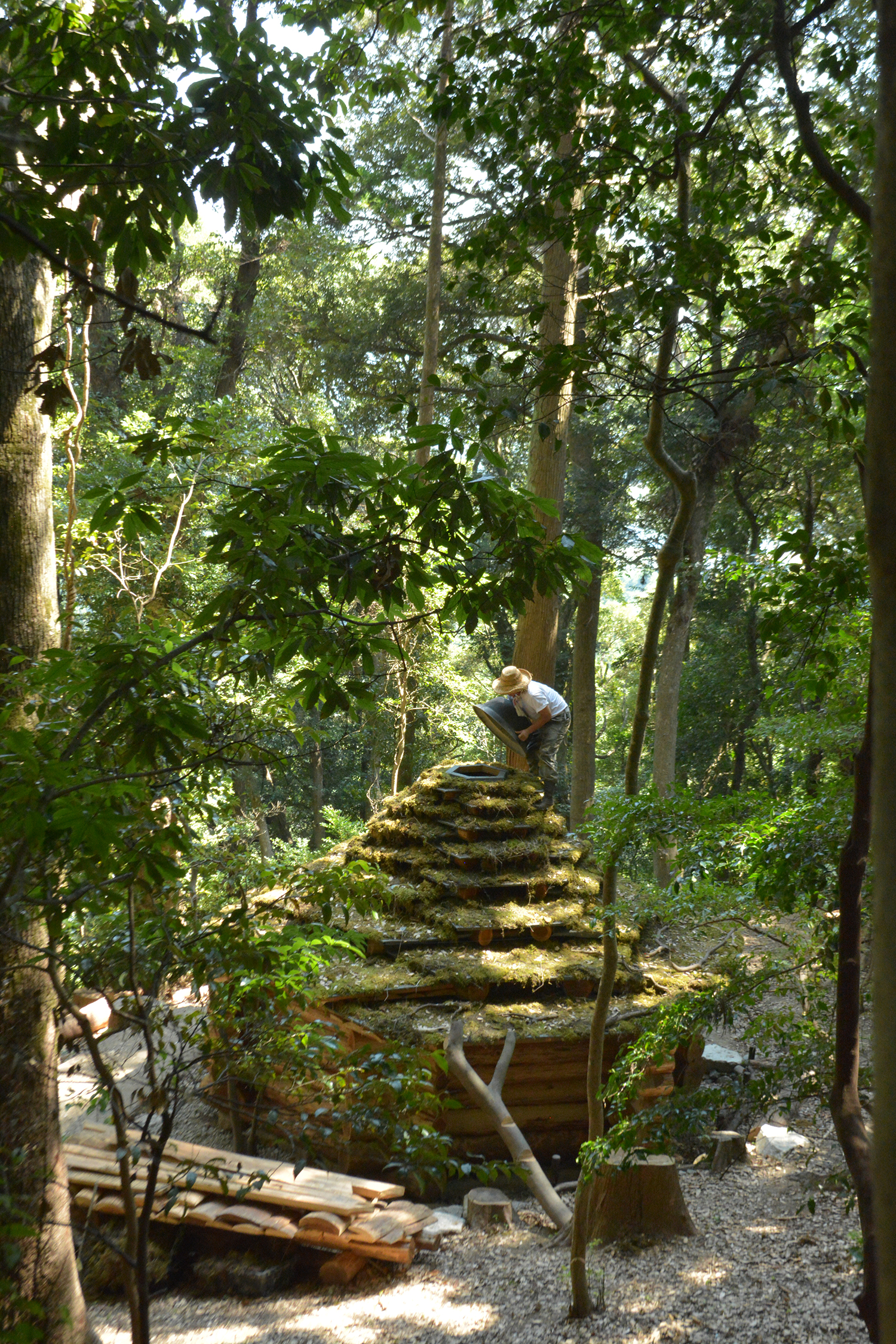 ½Ã°øÀº ½×°í, ¸ØÃß°í, ´Ù½Ã Á¶Á¤ÇÏ´Â ´À¸° °úÁ¤À¸·Î ÁøÇàµÇ¾ú´Ù. »ý¸ñÀÇ Å볪¹«´Â °¢°¢ ±½±â¿Í Áö¸§, ÈÖ¾îÁüÀÌ ´Þ¶ú°í, ½ÇÁ¦·Î °¡°øÇغ¸¸é µµ¸é°ú ÀÏÄ¡ÇÏÁö ¾Ê´Â °æ¿ì°¡ ´ëºÎºÐÀ̾ú´Ù. ÇöÀå¿¡¼ ÀûÀýÇÑ Å볪¹«¸¦ ´Ù½Ã °í¸£°í, °ÇÁ¶¿¡ µû¸¥ ¼öÃàÀ» °í·ÁÇØ üÀÎÅé°ú ½ºÅ©¶óÀ̹ö·Î ¹Ì¼¼ÇÑ Á¶Á¤À» ¹Ýº¹Çß´Ù. ÀÌ·¯ÇÑ ½ÃÇàÂø¿À ¼Ó¿¡¼ º®Àº 39°³ÀÇ Å볪¹«·Î ÃÑ 13´Ü±îÁö ÇÑ ´Ü¿¡ 3°³¾¿ ¼·Î ¸Â¹°¸®°Ô ½×¾Ò°í, ÀÌ °æÇèÀ» Åä´ë·Î ÇÏ¿© ÁöºØµµ º®À» ½×¾Æ ¿Ã¸®´Â ¹æ¹ý°ú °°ÀÌ ·Î±×ÇϿ콺 ±¸Á¶·Î ½×¾Æ ¿Ã·È´Ù. ²À´ë±â¿¡´Â õâÀÌÀÚ ¿¬±â°¡ ºüÁ®³ª°¡´Â À°°¢ÇüÀÇ ±¼¶ÒÀ» ¸¶·ÃÇÏ¿´°í, »ç¿ëÇÏÁö ¾ÊÀ» ½Ã¿¡´Â ¿À·¡µÈ °¡¸¶¼ÜÀ¸·Î À̸¦ µ¤´Â´Ù. ÁöºØÀº ´ÜÂ÷¸¦ µÐ ±¸Á¶ À§¿¡ ¾Æ½ºÆÈÆ® ·çÇÎÀ̶ó´Â ¸¶°¨À縦 ¾ñ¾ú°í, ±× À§¿¡ À̳¢°¡ ÀÚ¸® Àâµµ·Ï ¸¶¹«¸®Çß´Ù.