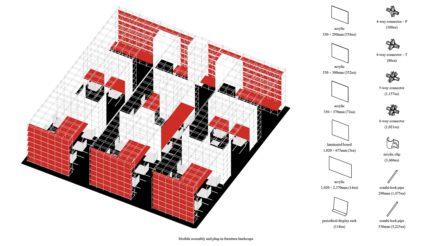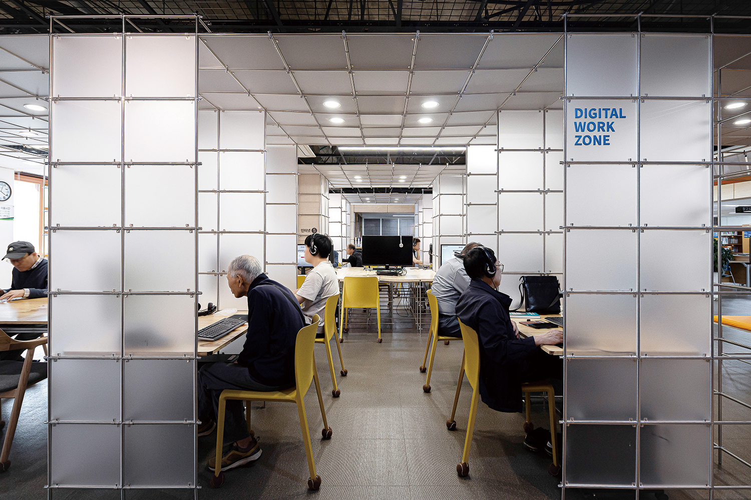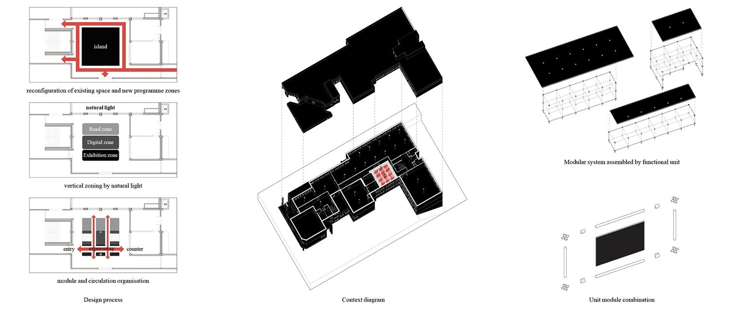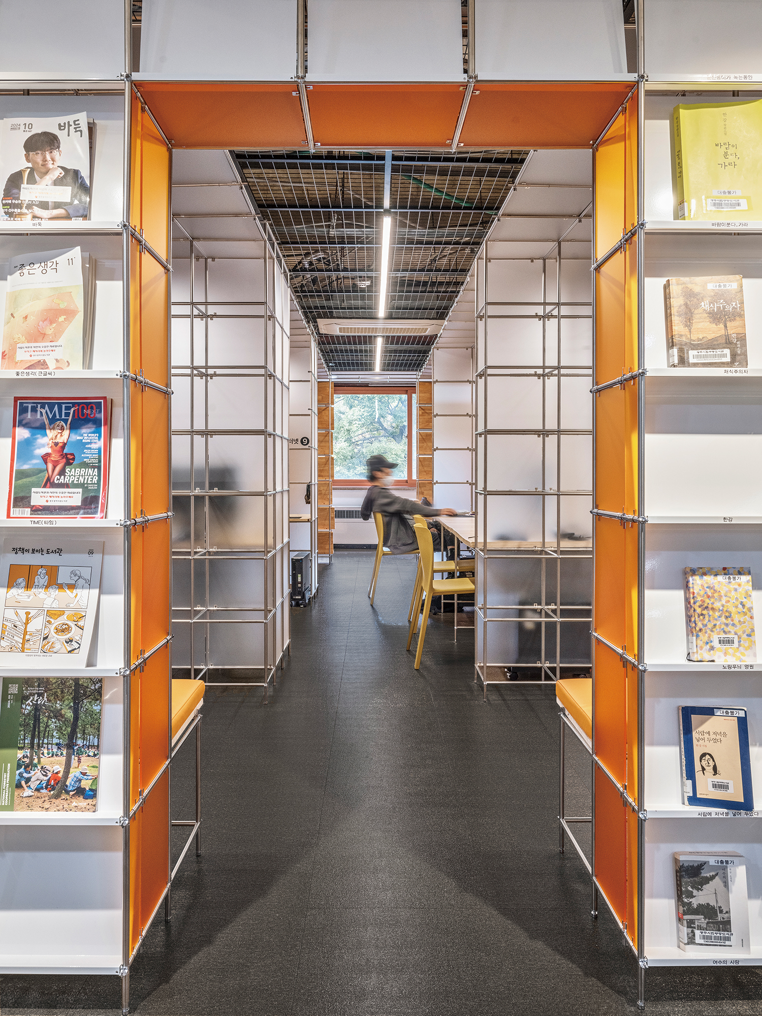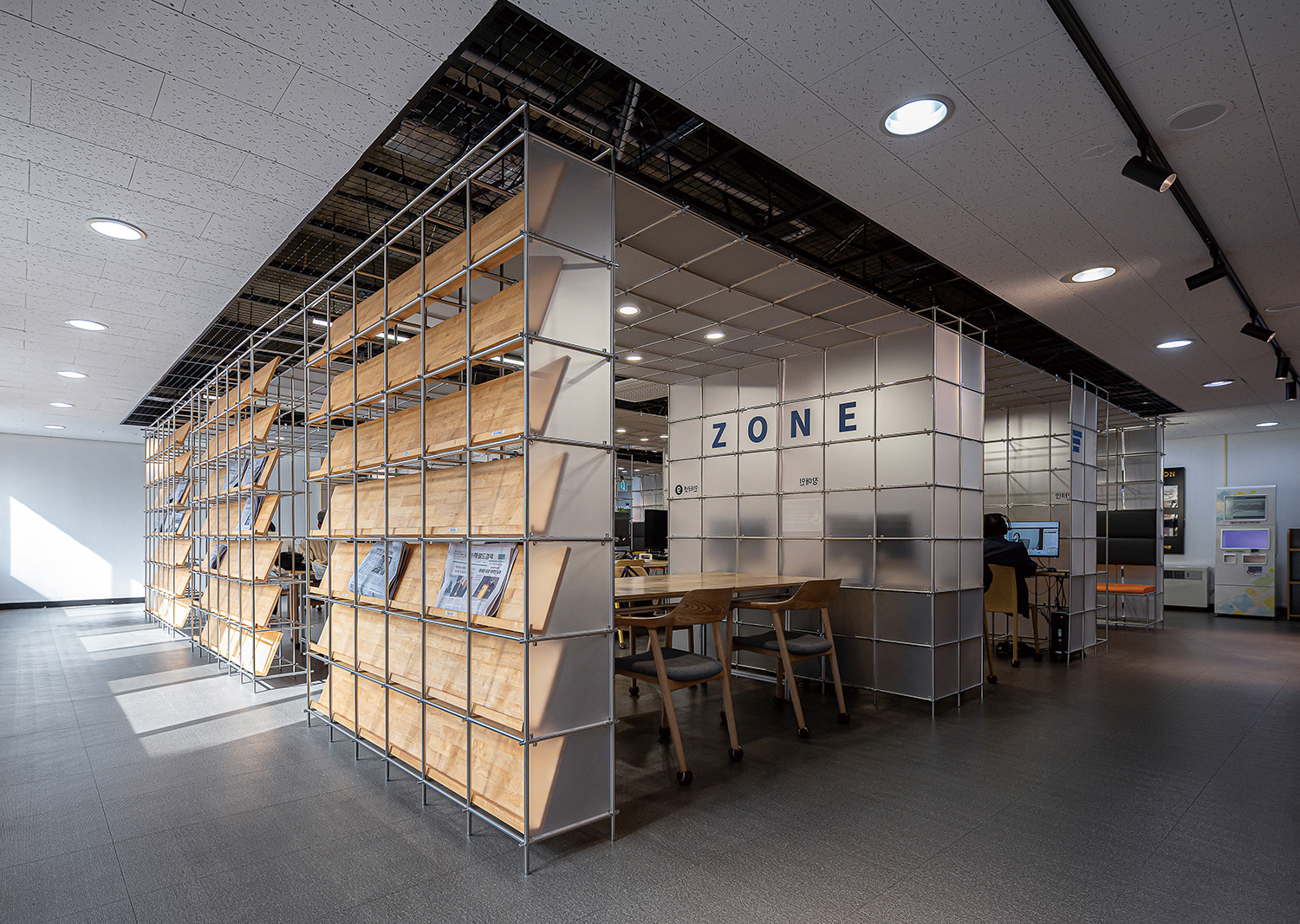 ±¤ÁÖ¹«µîµµ¼°üÀº 40¿© ³â°£ ±¤ÁÖÀÇ ¡®´ëÇ¥µµ¼°ü¡¯ÀÇ ¿ªÇÒÀ» ÇØ¿ÔÁö¸¸, »õ·Î¿î ´ëÇ¥µµ¼°üÀÇ °³°üÀ» ¾ÕµÎ°í ±â´É ÀüȯÀÇ ½Ã±â¸¦ ¸ÂÀÌÇϰí ÀÖ´Ù. ÀÌ ÇÁ·ÎÁ§Æ®´Â ÀÌ¿ë·üÀÌ ³·¾ÆÁø 1Ãþ µðÁöÅÐÀÚ·á½ÇÀÇ ÀϺΠ±â´ÉÀ» 2Ãþ Á¾ÇÕÀÚ·á½Ç·Î ÀÌÀüÇÏ´Â °úÁ¤¿¡¼ ¹ß»ýÇÑ 132m2 ±Ô¸ðÀÇ °ø°£À» À籸¼ºÇÏ´Â ÀÛ¾÷ÀÌ´Ù. Á¦ÇÑµÈ ¿¹»ê°ú °ø»ç ±â°£À̶ó´Â °ø°ø ÇÁ·ÎÁ§Æ®ÀÇ Á¶°Ç ¼Ó¿¡¼, ¼³°è´Â ÇüŸ¦ ÀÓÀÇ·Î ¸¸µå´Â ´ë½Å »ý»ê¹æ½ÄÀ» ÀüȯÇÏ´Â µ¥ ÁýÁßÇß´Ù. ÇöÀå ¸ñ°ø Áß½ÉÀÇ ½Ã°ø ¹æ½ÄÀ» ÃÖ¼ÒÈÇϰí, °øÀå¿¡¼ Á¦ÀÛµÈ ±â¼º ¸ðµâ·¯ °¡±¸ ºÎÀ縦 Á¶¸³ÇØ ÇöÀå¿¡¼ È®ÀåÇØ³ª°¡´Â ½ÄÀ¸·Î °ø°£À» ¸¸µé¾ú´Ù. 330mm¿Í 345mm ¸ðµâÀ» ±â¹ÝÀ¸·Î ÇÑ ¹Ýº¹ ±¸Á¶´Â Ã¥»ó, ¼°¡, ÆÄƼ¼Ç µîÀÇ ¿ä¼ÒµéÀ» ÇϳªÀÇ ½Ã½ºÅÛ ¾È¿¡¼ Á¶Á÷ÇÏ¸ç °ø°£ÀÇ Áú¼¸¦ Çü¼ºÇÑ´Ù. ÀÌ·¯ÇÑ ¸ðµâ ½Ã½ºÅÛÀº Çʿ信 µû¶ó ºÎÀ縦 Ãß°¡Çϰųª Àç¹èÄ¡ÇÒ ¼ö ÀÖ¾î ÇâÈÄ °ø°£ÀÇ º¯È¿¡µµ À¯¿¬ÇÏ°Ô ´ëÀÀÇÒ ¼ö ÀÖ´Ù. ¹ÝÅõ¸í ¹°¼ºÀÇ ¾ÆÅ©¸± ÆÐ³ÎÀº Á¾ÀÌ¿Í °°Àº Áú°¨À¸·Î °ø°£ ³»ÀÇ ¼·Î ´Ù¸¥ ÇÁ·Î±×·¥À» Á¶À²Çϸç, ºû°ú ½Ã¼±ÀÇ È帧À» ¿Ï¸¸ÇÏ°Ô ºÐÀýÇÑ´Ù. ÀÌ ÇÁ·ÎÁ§Æ®´Â ÀÛÀº ±Ô¸ðÀÇ °ø°ø ¸®¸ðµ¨¸µ¿¡¼ Á¶¸³°ú Àç»ç¿ëÀ» ÅëÇØ °ø°£ÀÇ ¹Ðµµ¿Í À¯¿¬¼ºÀ» È®º¸ÇÏ·Á´Â ½Ãµµ´Ù.