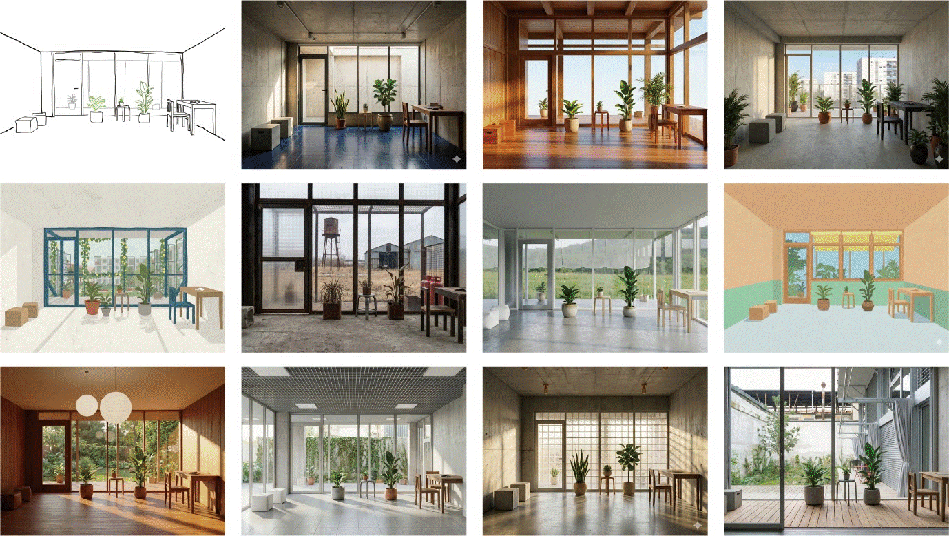 µÑ°´Â µ¶¸³Çü »ý¼ºÇü AI(Nano Banana, Midjourney µî)ÀÌ´Ù. ·¯ÇÁÇÑ ½ºÄÉÄ¡³ª ÅØ½ºÆ® ÀԷ¸¸À¸·Î °ø°£ÀÇ ºÐÀ§±â¸¦ Áï°¢ ½Ã°¢ÈÇϸç, ¼³°èÀÚÀÇ Àǵµ°¡ ¹Ý¿µµÈ ¸ÂÃãÇü À̹ÌÁö¸¦ »ý¼ºÇÑ´Ù. ¶ÇÇÑ »ý¼ºµÈ À̹ÌÁö¸¦ ºÎºÐÀûÀ¸·Î ¼öÁ¤¡¤º¸¿ÏÇÒ ¼ö ÀÖ¾î, »õ·Î¿î À̹ÌÁö Á¦ÀÛºÎÅÍ ±âÁ¸ °á°ú¹°ÀÇ °íµµÈ±îÁö Æø³ÐÀº Ȱ¿ëÀÌ °¡´ÉÇÏ´Ù.