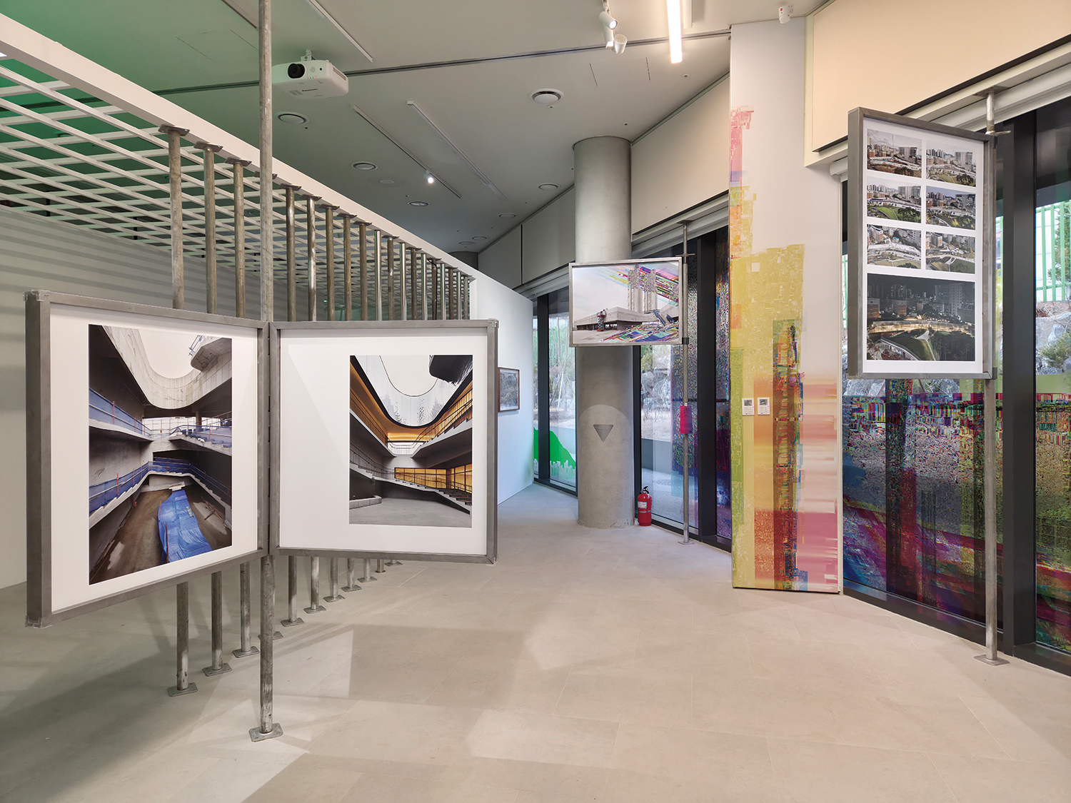 ÇÑÆí °Ç¸³±â·ÏÀüÀº °Ç¹°ÀÇ ¿Üº®, ÀÜµð¸¶´ç µî ¹Ì¼ú°ü ¿ÜºÎ °ø°£À¸·Î À̾îÁø´Ù. ·Îºñ¿¡¼ ÁöÇÏ·Î ³»·Á°¡´Â ¿¡½ºÄ÷¹ÀÌÅÍ Á¤¸éÀÇ º®°ú ÇÏ¿ªÀå ÀÔ±¸ ¼ÅÅÍ¿¡´Â ºêÀÌ¿£¾ËÀÇ ¡®´õ ±×·£µå Åõ¾î¡¯ ¿¬ÀÛ µÎ Á¡ÀÌ °¢°¢ ¼³Ä¡µÆ°í, ½ÅÁö¼±ÀÇ ¡®¼¼¿ïÇÇµð¾Æ¡¯ ¿¬ÀÛÀº ¹Ì¼ú°ü ³» Ä«Æä ±âµÕ°ú °Ç¹° ¿Üº® ³× °÷¿¡ °¢°¢ QRÄڵ带 ºÎÂøÇØ Çö½ÇÀÇ Ç³°æ°ú ¿À¹ö·¦µÈ À̹ÌÁö¸¦ °ü¶÷ÀÚ°¡ üÇèÇϵµ·Ï Çß´Ù. °Ç¸³ »çÁø À̹ÌÁö µ¥ÀÌÅÍ¿¡ º¯ÇüÀ» °¡ÇØ ¹ß»ýÇÑ ½Ã°¢Àû ±³¶õ(±Û¸®Ä¡)À» ÆÐÅÏÈÇÑ ºêÀ̾ؾËÀÇ ÀÛ¾÷Àº ½ºÆ©µð¿À1ÀÇ À¯¸® º®¸é¿¡ ºÎÂøµÇ¾î, Àü½Ã °ø°£°ú ÁÖº¯ dz°æÀ» ½Ã°¢ÀûÀ¸·Î ¸Å°³ÇÑ´Ù. ¹Ì¼ú°ü Àܵ𸶴翡 ¼³Ä¡µÈ ÄÁÅÛÆ÷·ÎÄÃÀÇ ¡®ÀÏ·çÀü »çÀÎ_¾È¾çõ¡¯Àº µµ·ÎÇ¥ÁöÆÇ Çü½ÄÀ» Â÷¿ëÇØ ¹°±æÀÇ È帧°ú ¼Óµµ°¡ µµ½ÃÀÇ »î°ú ±³Â÷ÇÏ´Â ÁöÁ¡À» µå·¯³½´Ù. Ä¡¼ö»ç¾÷À¸·Î À¯¼ÓÀÌ »¡¶óÁø ¾È¾çõ°ú »ó½À Á¤Ã¼·Î ¾Ç¸íÀÌ ³ôÀº ¼ºÎ°£¼±µµ·Î¸¦ ´ëÁ¶ÇÔÀ¸·Î½á, ¿ìȸ¿Í Áö¿¬ÀÇ Åµµ¸¦ ÅëÇØ ´À¸®Áö¸¸ ¸Ö¸® ³ª¾Æ°¥ ¼ö ÀÖÀ½À» ¿ª¼³ÀûÀ¸·Î ¾Ï½ÃÇÑ´Ù.