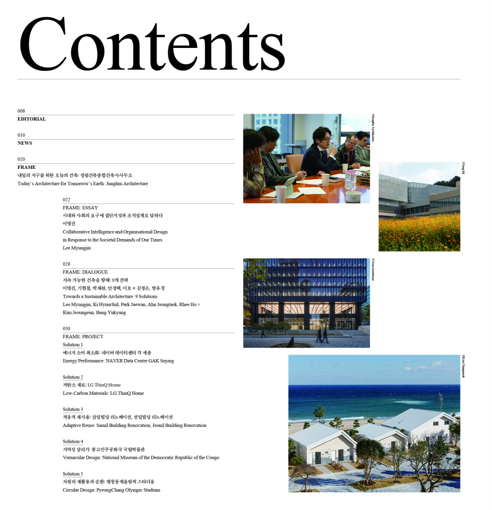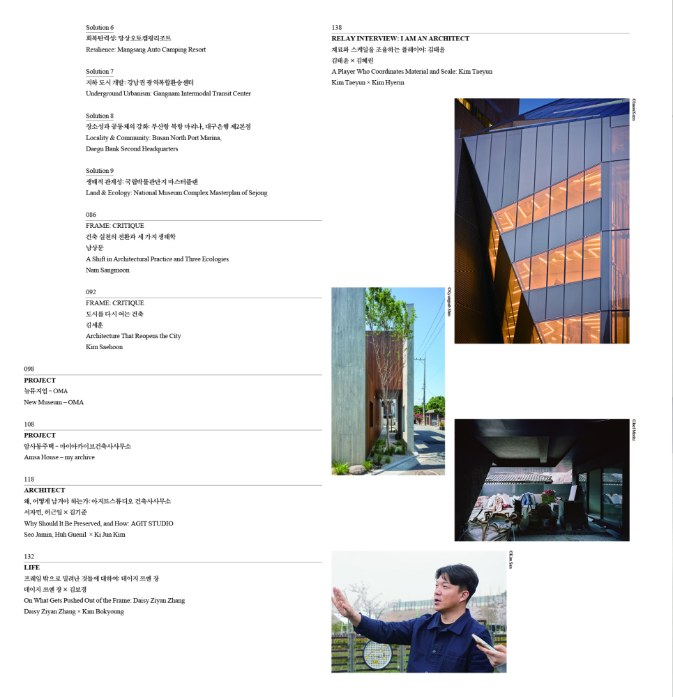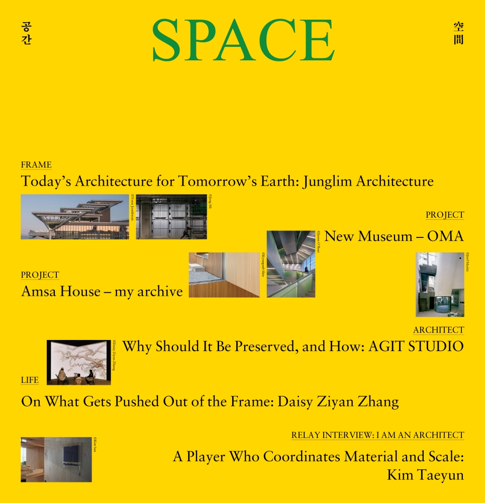 2017³â ¡¸SPACE(°ø°£)¡¹´Â Á¤¸²°ÇÃàÁ¾ÇÕ°ÇÃà»ç»ç¹«¼Ò(ÀÌÇÏ Á¤¸²°ÇÃà)ÀÇ Ã¢¸³ 50ÁÖ³âÀ» ¸Â¾Æ Ưº°È£ ¡ºOrdinary Senses(Àϻ󰨰¢)¡»¸¦ ¹ß°£ÇÑ ¹Ù ÀÖ´Ù. ÀÏ»ó ¼Ó¿¡¼ Á¤¸²°ÇÃàÀÌ ¸¸µé¾î¿Â °ø°£ÀÇ Àǹ̿¡ ÁÖ¸ñÇÑ ÀÌ Æ¯º°È£´Â, ¡®Çѱ¹Àû ¸ð´õ´ÏÁò¡¯(1967~1987), ¡®¼¼°èÈ ½Ã´ë¡¯(1988~1997), ¡®µµ½Ã°¨°¢¡¯(1998~2006), ¡®21¼¼±â °ø°ø °ø°£¡¯(2007~2017)ÀÇ ³× ½Ã±â·Î ³ª´©¾î °ø°£ ȯ°æÀÇ º¯È¿¡ ´ëÀÀÇØ¿Â Á¤¸²°ÇÃàÀÇ ±ËÀûÀ» ¼Ò°³Çß´Ù. À̹ø È£ ÇÁ·¹ÀÓ ¡®³»ÀÏÀÇ Áö±¸¸¦ À§ÇÑ ¿À´ÃÀÇ °ÇÃ࡯Àº ±× ¿¬Àå¼±¿¡¼ Á¤¸²°ÇÃàÀÇ ´ÙÀ½ Çຸ¸¦ ¡®Áö¼Ó°¡´É¼º¡¯ÀÇ Ãø¸éÀ¸·Î »ìÆìº¸´Â ±âȹÀÌ´Ù. ³ª¾Æ°¡ Áö¼Ó°¡´É¼ºÀ̶ó´Â °üÁ¡ÀÌ ¿À´Ã³¯ ¼³°èÀÇ Áß½ÉÀ¸·Î À̵¿Çϰí ÀÖÀ½À» È®ÀÎÇÏ´Â ÀÚ¸®À̱⵵ ÇÏ´Ù. Áö¼Ó°¡´É¼º, ģȯ°æ ¼³°è, »ýÅÂÁÖÀÇ, ȸº¹Åº·Â¼º µî ȯ°æÀ» °í·ÁÇÏ´Â °³³äÀº ÀÌ¹Ì Àü ¼¼°èÀûÀ¸·Î °ø°¨´ë°¡ Çü¼ºµÅ ÀÖ°í, °ÇÃàÀû ½Çõ ¶ÇÇÑ ´Ù¾çÇÏ°Ô Àü°³µÇ°í ÀÖ´Ù. ÀÌ·¯ÇÑ °¡Ä¡¸¦ Àü¸é¿¡ ³»¼¼¿ì´Â °Í ÀÚü´Â »õ»ï½º·´Áö ¾Ê´Ù. ´Ù¸¸, À̰ÍÀÌ ±¹³» µµ½Ã¡¤°ÇÃà°è¿¡¼ ÃÑüÀûÀ̰í À¶ÇÕÀûÀÎ ½ÇõÀ¸·Î À̾îÁ³´ÂÁö´Â º°°³ÀÇ ¹®Á¦´Ù. Á¤¸²°ÇÃàÀº 1967³â ¼³¸³ ÀÌ·¡ ±¹°¡ ÁÖµµÀÇ µµ½Ã ¹ßÀüÀ» °ßÀÎÇØ¿ÔÀ¸¸ç, ¼¼°èÈÀÇ È帧 ¼Ó¿¡¼ °ø°ø ÀÎÇÁ¶ó, »ó¡Àû °ø°£, ´ëÇü º¹ÇÕ°³¹ß, µµ½ÃÀç»ý¿¡ À̸£±â±îÁö Æø³ÐÀº ¿µ¿ªÀ» ÁÖµµÇؿ ´ëÇü ¼³°èÁ¶Á÷ÀÌ´Ù. À̹ø ÇÁ·¹ÀÓÀº ÀÌ Á¶Á÷ÀÌ ±âÈÄ À§±â ´ëÀÀÀ̶ó´Â »çȸÀû ¿ä±¸¿¡ ¾î¶»°Ô ÀÀ´äÇϰí ÀÖ´ÂÁö »ìÆìº¸´Â Áö¸éÀÌÀÚ, °ÇÃà°è ÃÖÀü¼±¿¡¼ ¿ì¸®°¡ Á÷¸éÇÑ Çö½Ç°ú °úÁ¦¸¦ È®ÀÎÇÏ´Â ±âȸÀ̱⵵ ÇÏ´Ù.