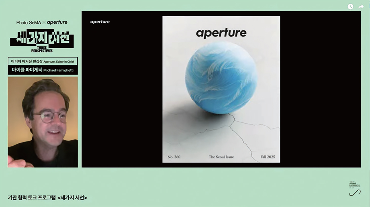 Joining online via Zoom, Michael Famighetti introduced Aperture¡¯s editorial direction and the context behind ¡®The Seoul Issue¡¯. Since launching its Cities series in 2014 with ¡®The São Paulo Issue¡¯, Aperture has published city-focused editions in collaboration with local guest editors, aiming to reflect each city¡¯s cultural context while featuring contemporary photography, interviews, research, and curatorial content. The decision to spotlight Seoul, Famighetti explained, stemmed from the belief that the city represents one of the most significant contemporary scenes for both modern photography and photographic history—marked by the post-martial law protests, the rise of a sophisticated consumer culture, and the grand spectacle of late capitalism.
