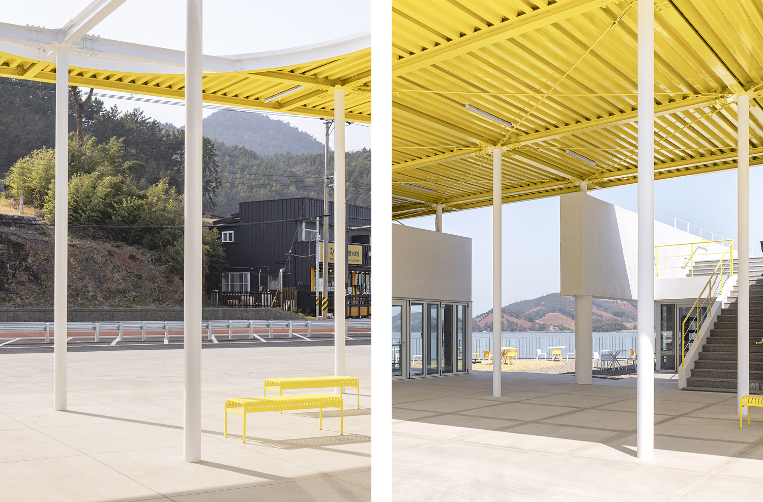 The building¡¯s plan adopts a T-shaped configuration. To the west, a long, linear roof runs parallel to the road, sheltering three contiguous retail units. To the east, a semicircular volume projects toward the ocean. This arrangement was chosen as a response to the site¡¯s two defining contexts of the local community and its natural landscape. On one side is a market that fosters an active, communal setting for residents, while on the other side a café is sited to capture the beautiful landscape, offering a quieter space in which to pause and reflect. The thin, lightweight roof was one of the elements to which we paid particular attention during the design process. Spanning a broad area covering the retail zone, it weaves the interior and exterior into a single spatial flow and creates a weather-proof environment for the market. Its underside was painted a bright yellow, both to bring a sense of vitality to what could otherwise be a dimly shaded area, and to visually accentuate the paper-thin lightness of the roof¡¯s form. While this distinctive roofline could easily become the site¡¯s main visual feature, we hoped instead that it would serve as a backdrop to the diverse activities of the people beneath it. We imagined that the scenes of market-like exchange that unfold here would catch the eye of passersby and naturally draw them into the space. Although the facility is relatively modest in scale, we divided it into three separate volumes to create a variety of outdoor spaces in between. By making active use of bi-fold doors, we expanded indoor activities to the outward space, enabling the space to be used more broadly and flexibly beyond its physical limits. In traditional markets, individual stalls are often narrow, yet the benches and stands set beneath the roof create the experience of a much larger marketplace. Similarly, we wanted to blur boundaries so that the activities of the shops could extend directly into the outdoor spaces.