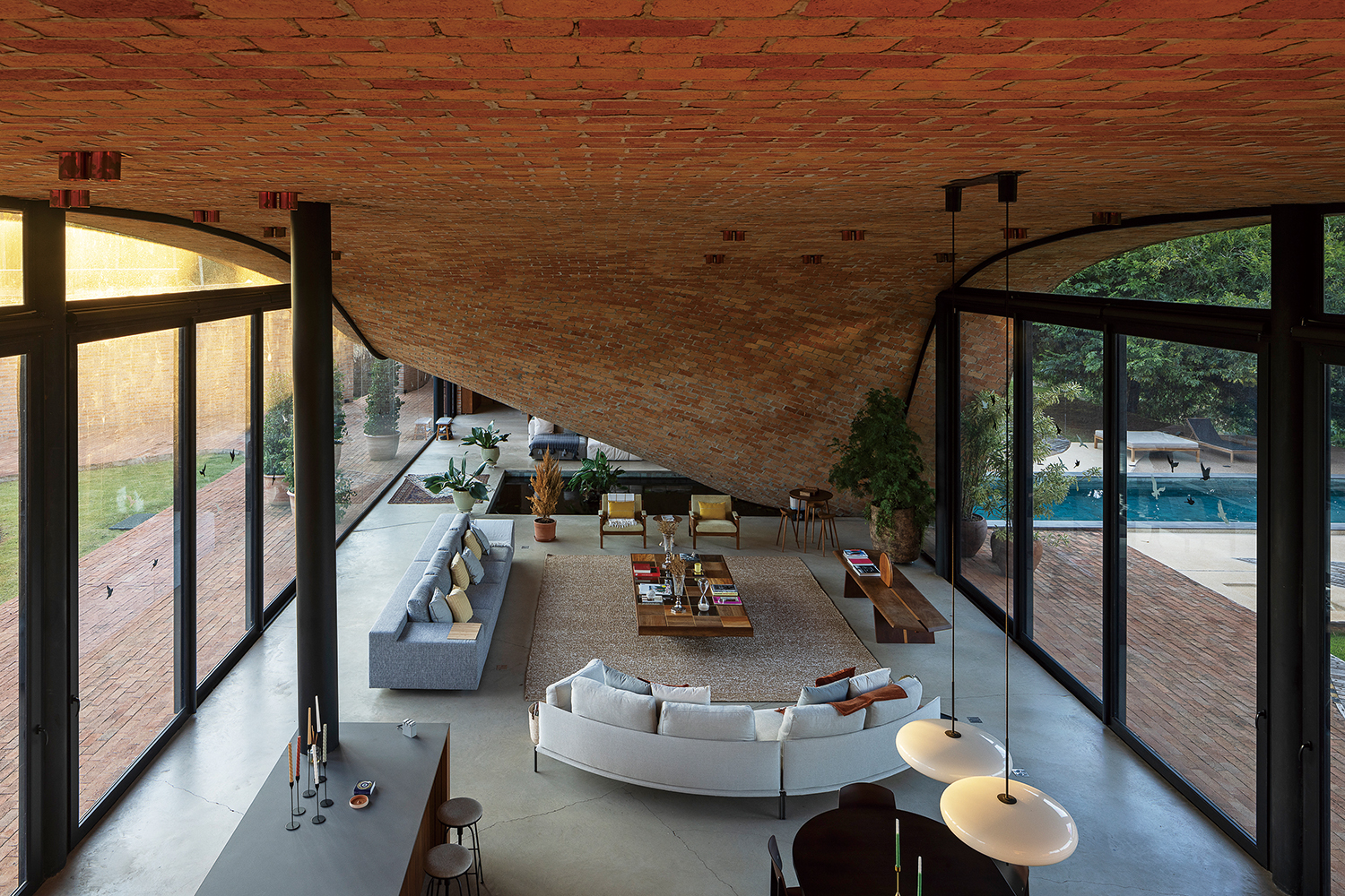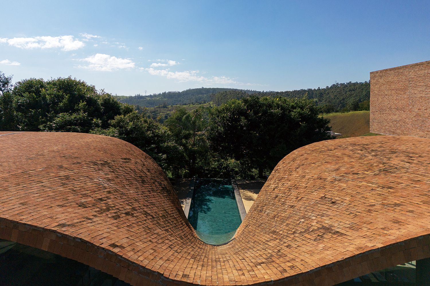 Mareines, Van Beneden: The climate of this region does not differ much from the typical conditions of the Atlantic Forest: humid tropical. The idea was to create a double roof, forming an air cushion between the two slabs. This would greatly reduce heat and the need for mechanical cooling systems. It is important to note that the upper slab serves as a beautiful open terrace overlooking the surrounding mountainous landscape.