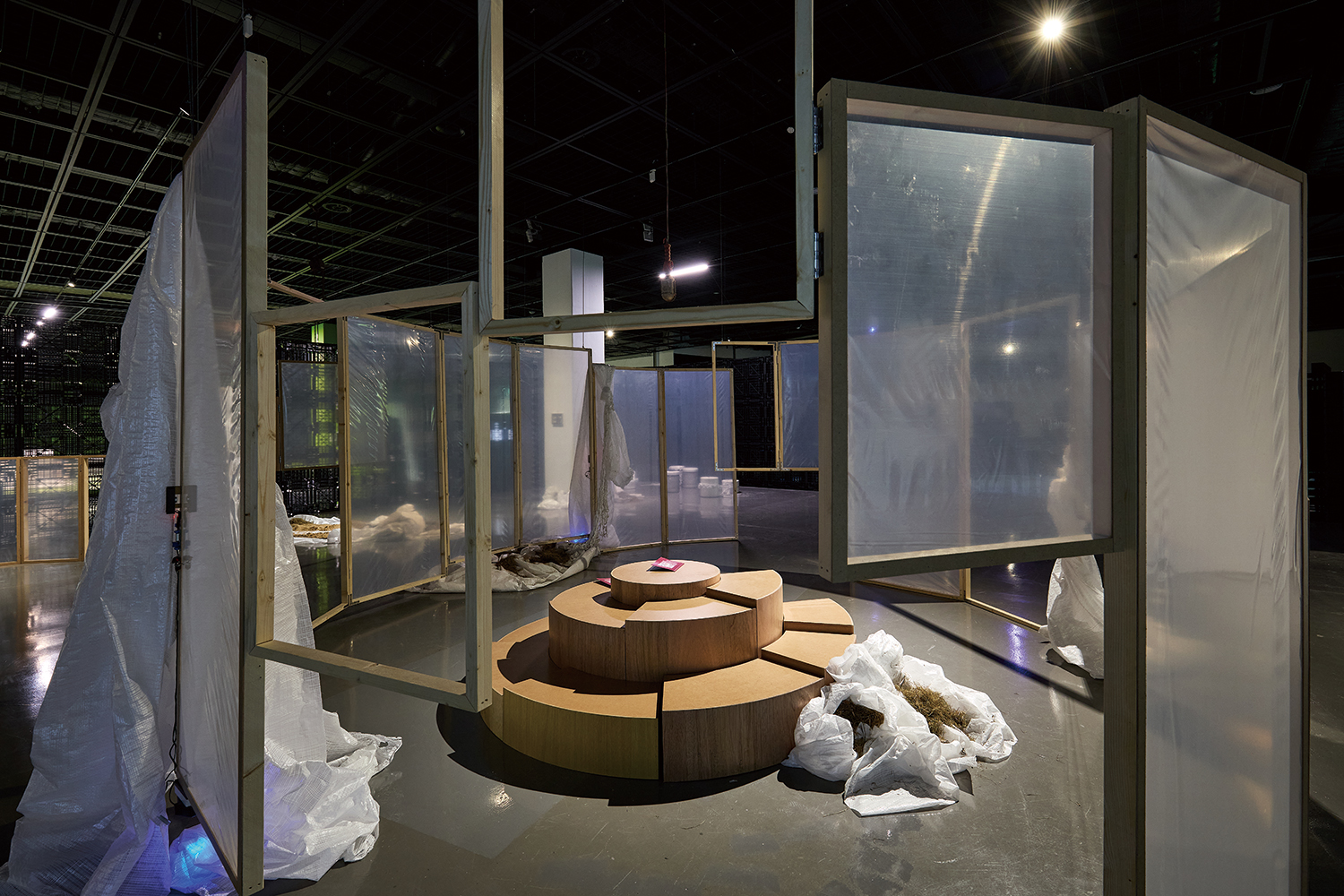 The exhibition can be broadly divided into works grounded in urban research and works that explore architectural approaches to constructing space. Research-driven projects are largely presented as installations that bring together objects collected locally in Busan and the results of field research. Rewriting Life in a Changing City by Common Senses focuses on the act of walking through the city, recreating the alleys of Busan¡¯s changing old downtown. Between pavilion structures made of construction scaffolding, videos and sounds collected on site have also been installed. As they explain, ¡®A city can only be remembered when it is recorded,¡¯ and the work concentrates on building a synesthetic archive of the disappearing historic centre. Displayed on the second floor, That¡¯s My Neighbour by The File Room likewise takes Yeongdo – one of the regions at the highest risk nationwide of depopulation – as its subject. They aim to offer a multilayered experience of a complex urban ecosystem, constituted by human and non-human entities alike: long-standing residents who have sustained the village, migrant workers inhabiting vacant houses, industrial landscapes produced by shipyards and metal workshops, and forms of life such as moss and weeds. Beyond physical installations, the project expands its media through publications, documenting the research process and augmented reality. While Common Senses¡¯ pavilion is constructed as a geometrically self-contained structure, The File Room disperses multiple installations throughout the space, inviting visitors to interpret narratives within a loosely connected network.