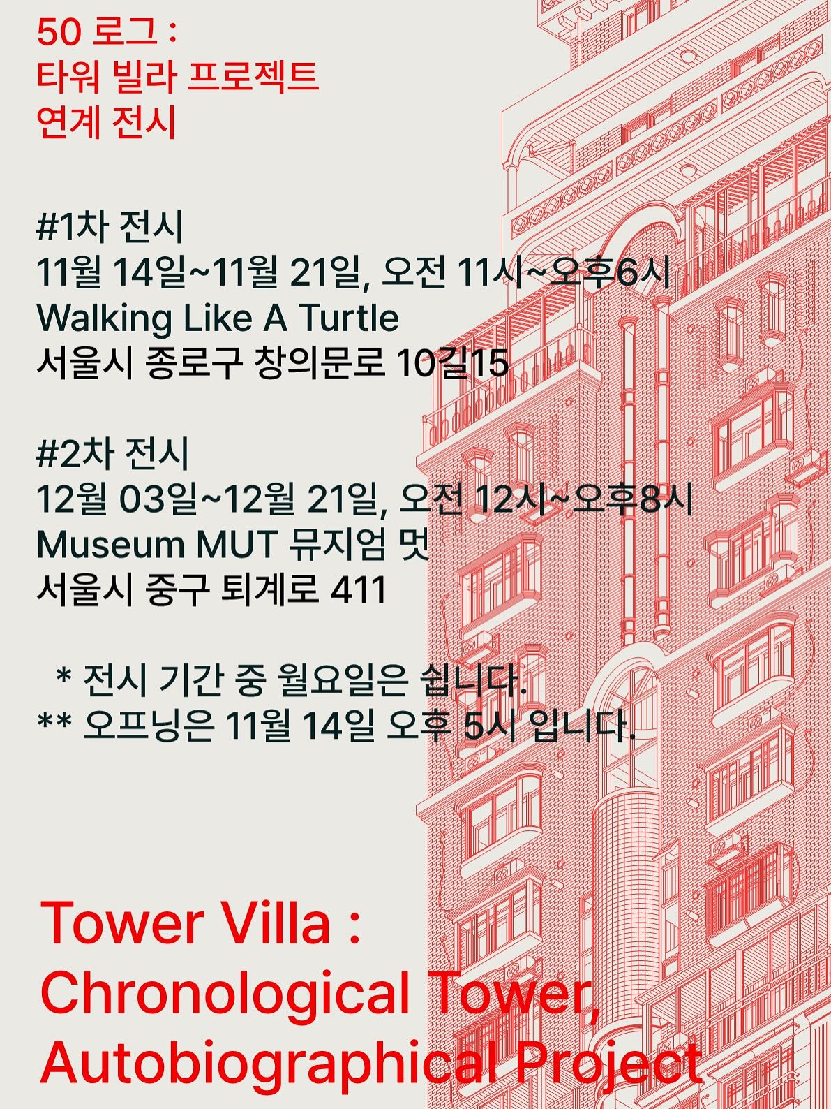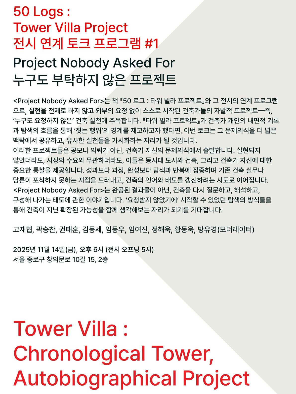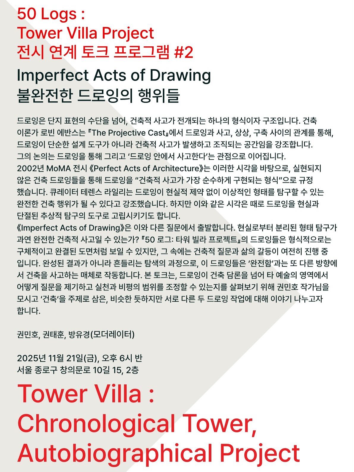 ¡ºÆÄ»çµå ¼¿ï¡»(2017), ¡ººô¶ó ¼¦½Ã¡»(2020), ¡º·Î±× 50: Ÿ¿ö ºô¶ó¡»(2025)¸¦ Æì³»¸ç Çѱ¹ÀÇ ÀÏ»óÀûÀÎ °ÇÃ๰µéÀÇ ³»·ÂÀ» µå·ÎÀ×À» ÅëÇØ Áý¿äÇÏ°Ô Å½±¸Çؿ °ÇÃà°¡ ±ÇÅÂÈÆÀÇ Àü½Ã <Ÿ¿ö ºô¶ó: ¿¬´ë±âÀû Ÿ¿ö, ÀÚÀüÀû ÇÁ·ÎÁ§Æ®(Tower Villa: Chronological Tower, Autobiographical Project)>°¡ ÁøÇà ÁßÀÌ´Ù. À̹ø Àü½Ã´Â Çѱ¹ ºô¶ó¸¦ ¹è°æÀ¸·Î »î°ú °ÇÃà, Çö½Ç°ú ÀÌ»ó »çÀÌÀÇ °£±ØÀ» ¼ºÂûÇÑ ÀÚÀüÀû ÇÁ·ÎÁ§Æ®ÀΡº·Î±× 50: Ÿ¿ö ºô¶ó¡»¿¡¼ Ãâ¹ßÇÑ´Ù. Ã¥¿¡ ´Ù ´ãÁö ¸øÇÑ µå·ÎÀ×°ú ¸ðÇüÀ» ¼±º¸ÀÌ´Â Àü½Ã´Â Çö½ÇÀÇ Ãæ½ÇÇÑ ±â·Ï¿¡¼ Ãâ¹ßÇÑ ÇÁ·ÎÁ§Æ®°¡ »ó»óÀ» À§ÇÑ µµ±¸·Î È®ÀåµÇ´Â °úÁ¤À» º¸¿©ÁØ´Ù. ¶ÇÇÑ 'ÀÚ¹ßÀûÀ¸·Î ½ÃÀÛÇÑ ¸®¼Ä¡ ÇÁ·ÎÁ§Æ®'ÀÇ °¡Ä¡¿Í ÀǹÌ, 'µå·ÎÀ×À̶ó´Â ¸ÅüÀÇ °¡´É¼º'À» º¸´Ù ¸¹Àº À̵é°ú ³íÀÇÇϱâ À§ÇØ Àü½Ã ±â°£ µ¿¾È µÎ Â÷·Ê ÅäÅ© ÇÁ·Î±×·¥ÀÌ ÁøÇàµÈ´Ù. Àü½Ã´Â µÎ °ø°£¿¡¼ ¼øÂ÷ÀûÀ¸·Î ÁøÇàµÇ¸ç, ÅäÅ© ÇÁ·Î±×·¥Àº 1Â÷ Àü½Ã ±â°£ µ¿¾È ¿¸°´Ù.