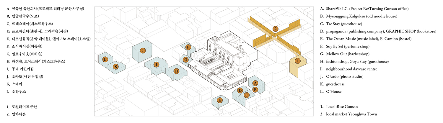 Àû»ê°¡¿Á°ú 1960~1970³â´ëÀÇ Á¶Àû ¹× ¿¬¿ÍÁ¶ ±×¸®°í ½ÅÃà °Ç¹° µî ´Ù¾çÇÑ ¿ä¼ÒµéÀÇ ÁýÇÕü Àüü¸¦ ¡®ÇÁ·ÎÁ§Æ® ¸®ÅÍ´× ±º»ê(Project Re\Turning Gunsan)¡¯À̶ó ºÎ¸¥´Ù. ¿©±â¿¡´Â ½Ã¹ÎµéÀÌ µ¹¾Æ¿Í µµ½É(Ô´ãý)ÀÇ ¡®¸¶À½(ãý)¡¯À» ȸº¹ÇØÁֱ⸦ ¹Ù¶ó´Â ¿°¿øÀÌ ´ã°Ü ÀÖ´Ù. ÀÌ »óÀÌÇÑ ¿ä¼ÒµéÀ» ´Ù·ç´Â Àü·«Àû ÀüÁ¦´Â ½ÃÀÛºÎÅÍ Áß¿äÇÑ °úÁ¦¿´°í, ±× °á°ú´Â µµ½Ã Çü»óÀ» ±¸ÃàÇØ ÇâÈÄ ±º»êÀ̶ó´Â ¼Òµµ½ÃÀÇ Çö»ó¿¡ ¹æÇâÀ» Á¦½ÃÇÏ´Â °ÍÀ̾î¾ß ÇÑ´Ù°í º¸¾Ò´Ù. µµ½Ã Çü»óÇÐÀÇ Á¤ÀÇ´Â ¾ÆÁ÷ À¯¿¬ÇÏ°Ô ¿·Á ÀÖ´Ù. µµ½ÃÀÇ ¸ð¾ç»õ¸¦ ±¸¼ºÇÏ´Â ¿©·¯ ¿ä¼ÒµéÀÇ ÃÑüÀûÀÎ ÇÕÀ¸·Î¼, ´ë°³ Á¤È®ÇÑ ´äÀ» ±¸Çϱ⺸´Ù´Â ´À½¼ÇÑ ¹æÇâÀ» ¸¸µå´Â °ÍÀ̶ó ÀÌÇØÇÑ´Ù.