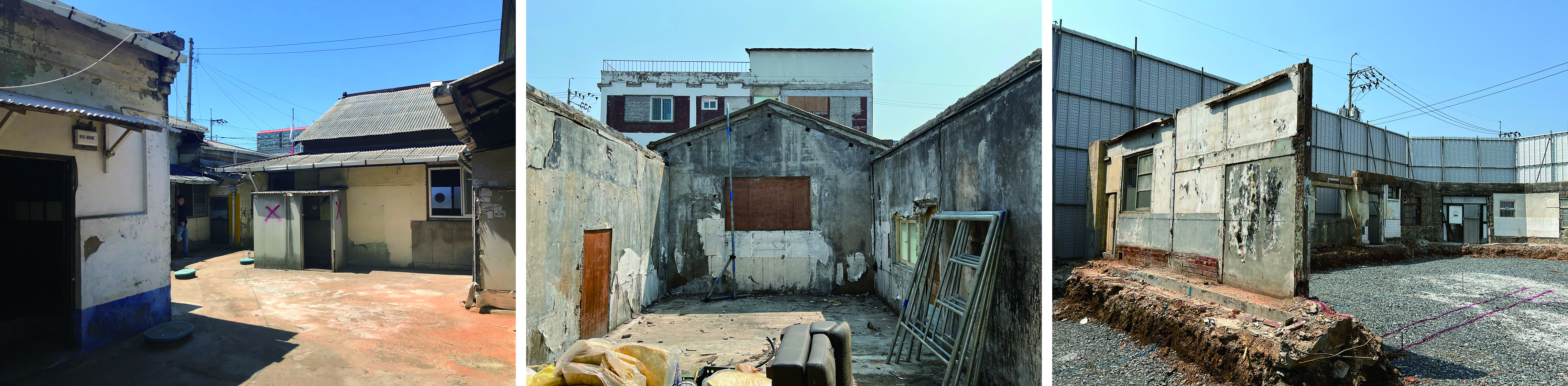 (¿ÞÂÊ) ±âÁ¸ ºÎÁö, (°¡¿îµ¥) ±×¶ó¿îµå Áß¾Ó¿¡ À§Ä¡ÇÑ ±âÁ¸ â°í, (¿À¸¥ÂÊ) ÀϺΠ¿¬¿ÍÁ¶ ¹× Á¶ÀûÁ¶ ÆÄ»çµå¸¸ ³²±â°í ö°ÅÇÑ °ø»ç ÇöÀå ©ISON Architects
